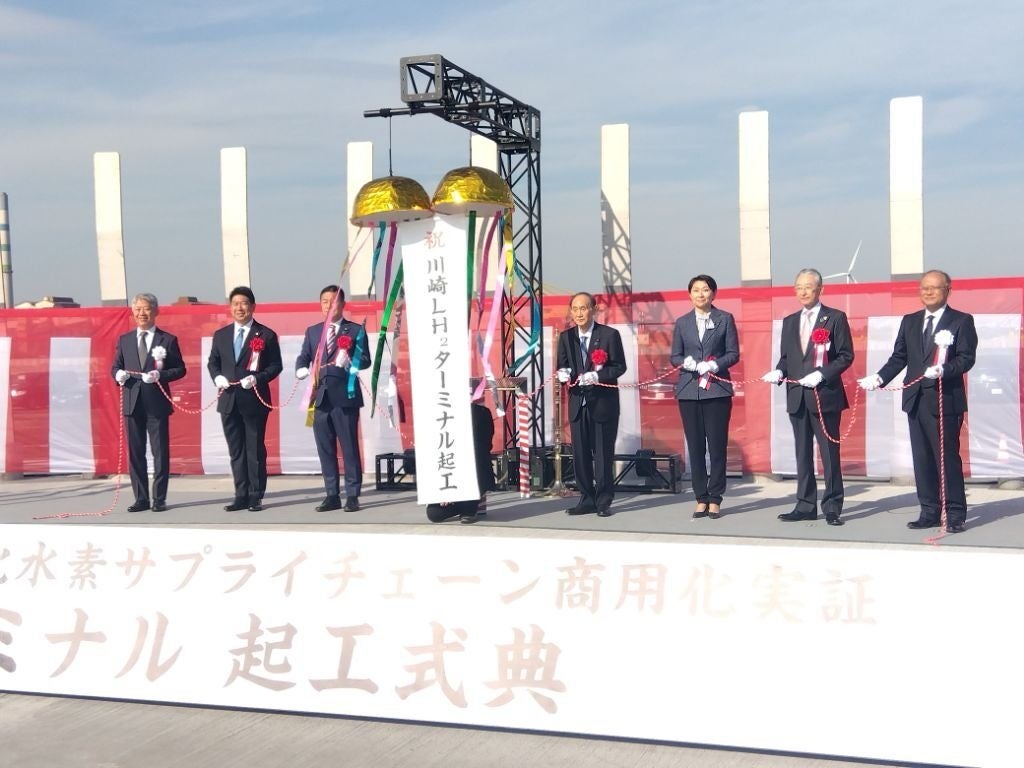 日本水素エネルギー株式会社(東京都港区)が国立研究開発法人新エネルギー・産業技術総合開発機構(NEDO)のグリーンイノベーション基金事業として進めている「液化水素サプライチェーンの商用化実証」において、扇島地区(川崎市川崎区)に整備する国際水素サプライチェーンの液化水素基地の起工式が11月27日に開催されました。この基地は商用規模の液化水素貯蔵・海上荷役設備等を備えた世界初※の施設となります。