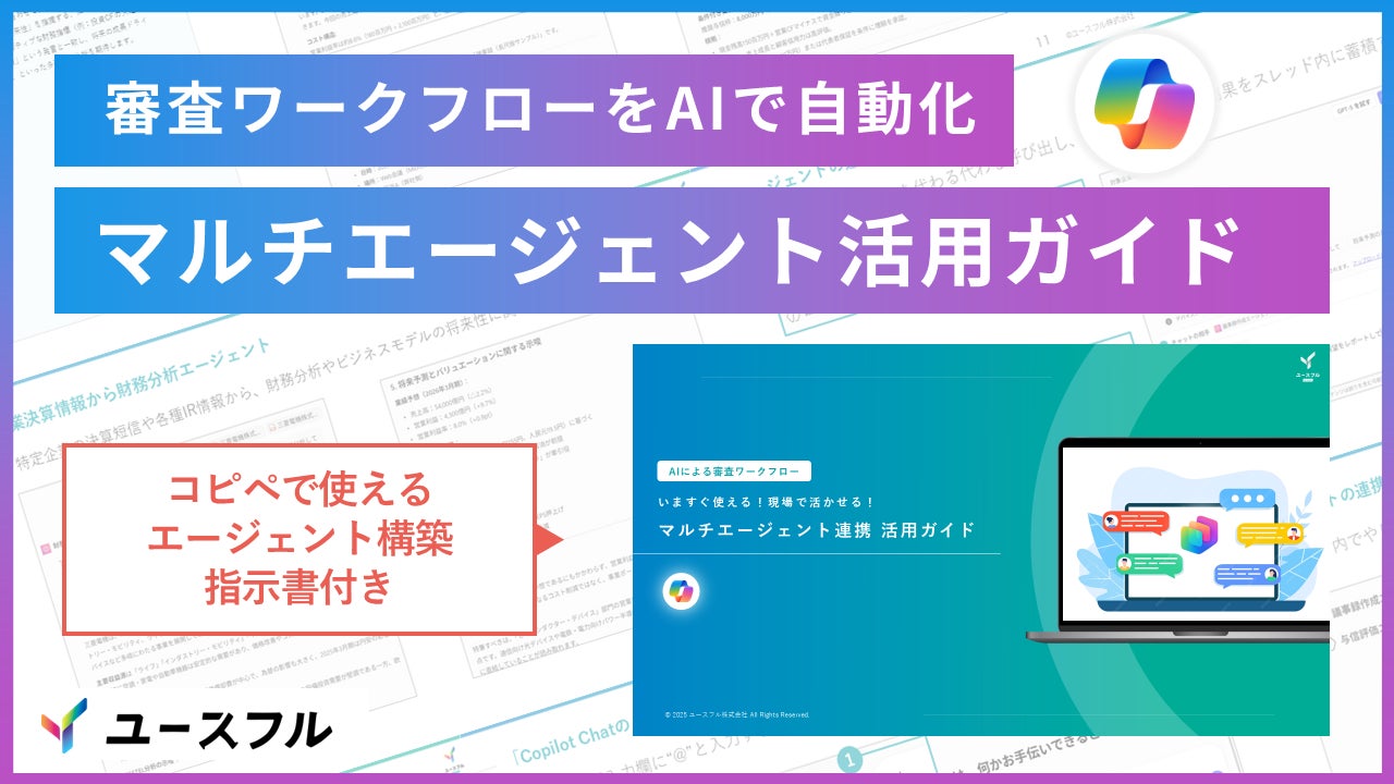 ユースフル株式会社(本社:東京都千代田区、代表取締役:大垣 凛太郎)は、Microsoft Copilot(以下、Copilot)の新機能である「Copilot Chatの @メンション機能」を活用し、複数のAIエージェントを連携させる「AIによる審査ワークフロー」の構築手順を解説した「マルチエージェント連携 活用ガイド」の無料配布を、12月1日より開始したことを発表します。本ガイドは、金融機関の融資担当者、事業会社のM&A・経営企画部門、与信管理部門の方々向けに、Copilot内で専門AIエージェントを連携させ、定性・定量の両面から審査プロセスを自動化するスキルを提供します。