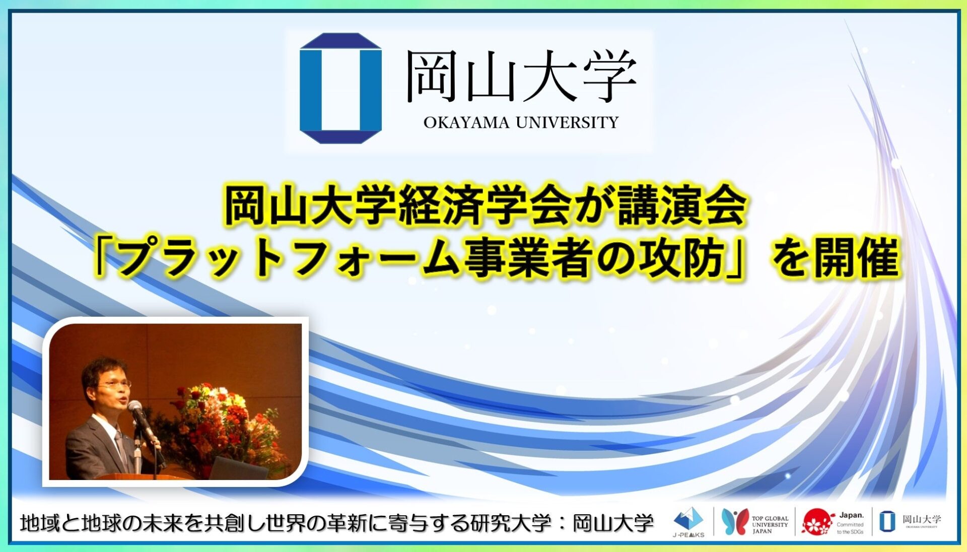 国立大学法人岡山大学(本部:岡山市北区、学長:那須保友)の経済学部の教員と学生でつくる岡山大学経済学会は2025年11月14日、講演会「プラットフォーム事業者の攻防」を本学津島キャンパスの創立五十周年記念館で開催しました。経済学部の学生、大学院社会文化科学研究科の学生、教員、外部の参加者らが聴講しました。