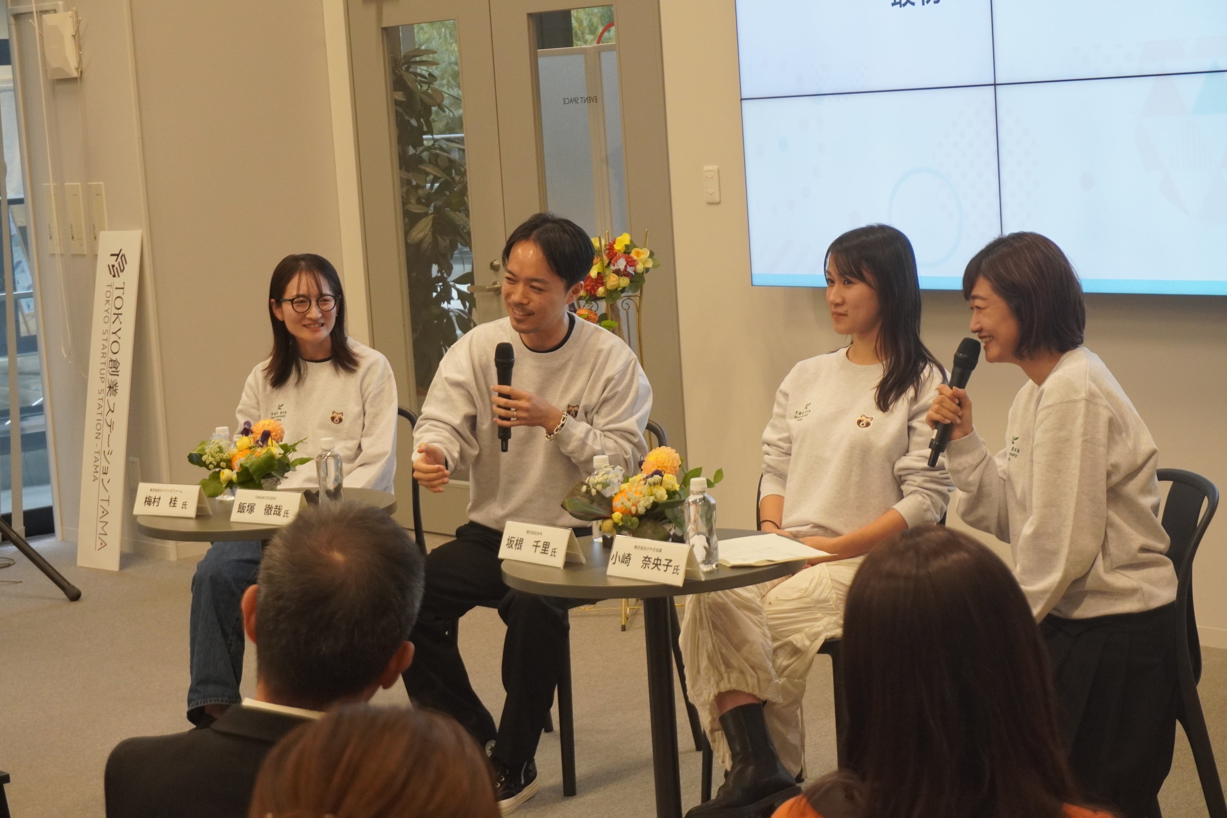 第2部では、パネルディスカッションを実施し、多摩地域で起業し活躍をされている3名(株式会社ネイバーズファーム 梅村 桂氏/TANUKI STUDIO 飯塚 徹哉氏/スナック水中 坂根 千里氏)にご登壇いただきました。スマート農業、アパレル、事業承継型の飲食店経営という、業種や起業のきっかけは三者三様でしたが、共通点は、多摩地域を愛し、多摩地域で起業、事業展開をされているという点です。多摩地域で起業を目指す方々にとっては最高のロールモデルであり、地元トークも交え身近な存在として語られる経験談は、まさに“わたし”サイズの起業について学ぶ良い機会となりました。