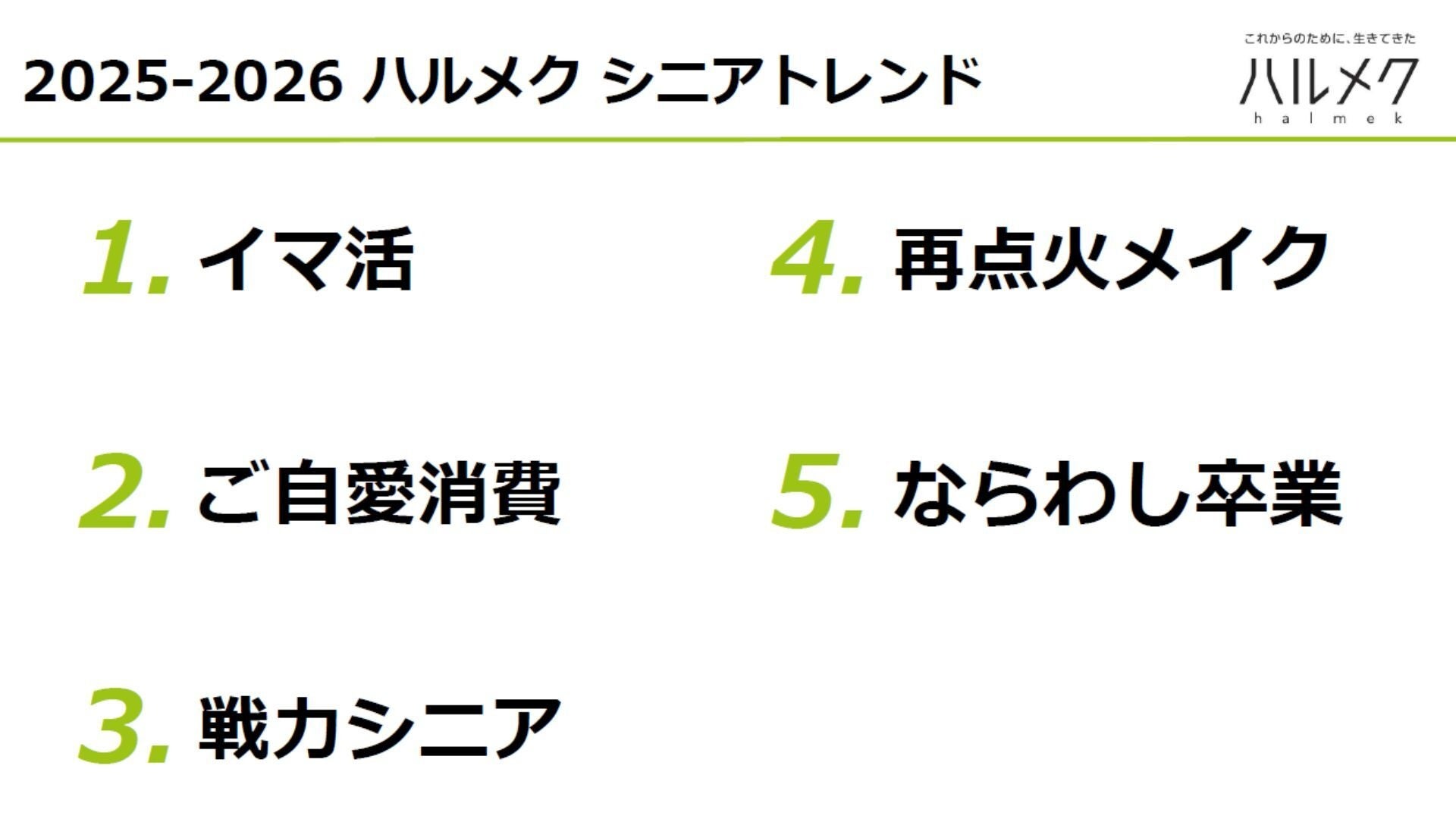 販売部数 No.1(※1)雑誌「ハルメク」などのマーケティングやリサーチのコンサルティングを通じて、50代以上のインサイトを日々探求する、ハルメク 生きかた上手研究所は、今年のシニア世代の動向を振り返り、2025-2026 ハルメク シニアトレンドを発表いたしました。