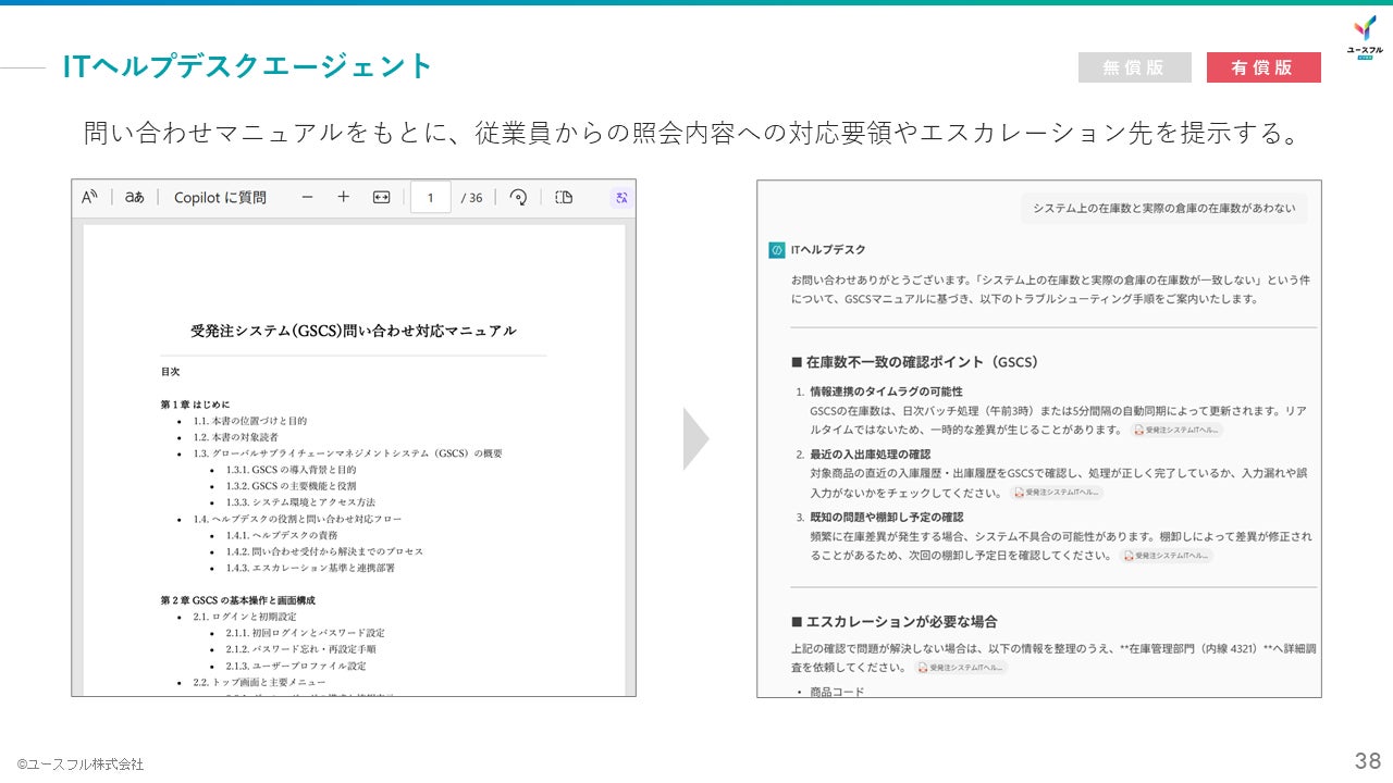 ライセンスコストを抑えた「無料版」による個人の業務効率化から、社内データベースと連携する「有料版」による組織的なナレッジ活用まで、企業の導入フェーズに合わせた最適な活用モデルを提示しています 。