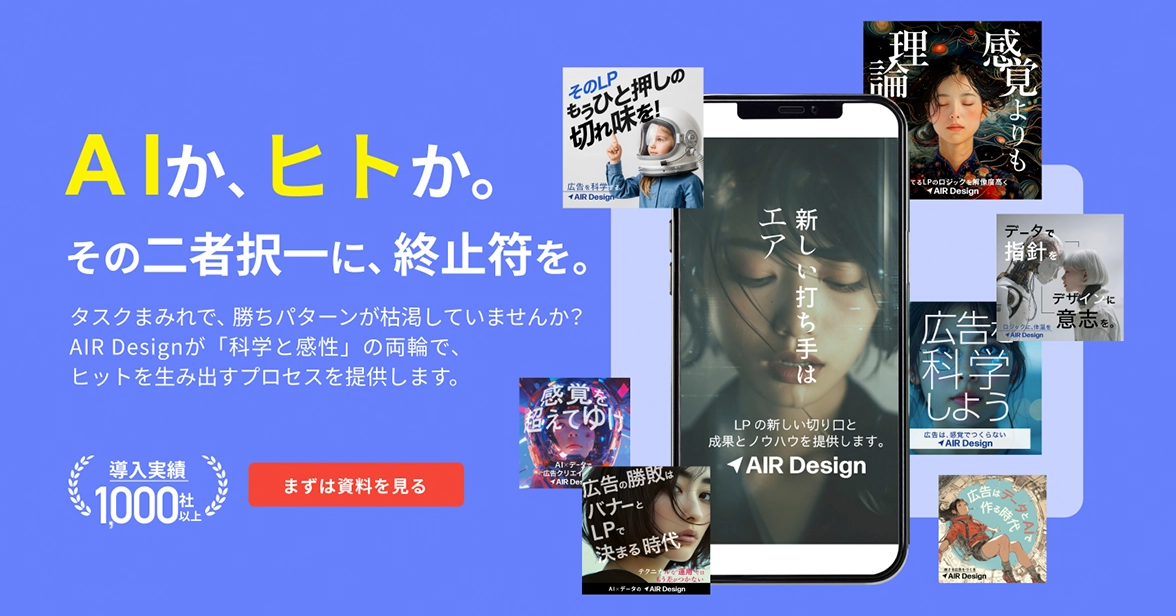AIR Designは、AIとデータを活用してWeb広告のクリエイティブ制作・改善を行うサービスです。プランナーやデザイナーなど5名のプロチームがクライアントに伴走し、売上や利益につながる本質的な改善を実現します。