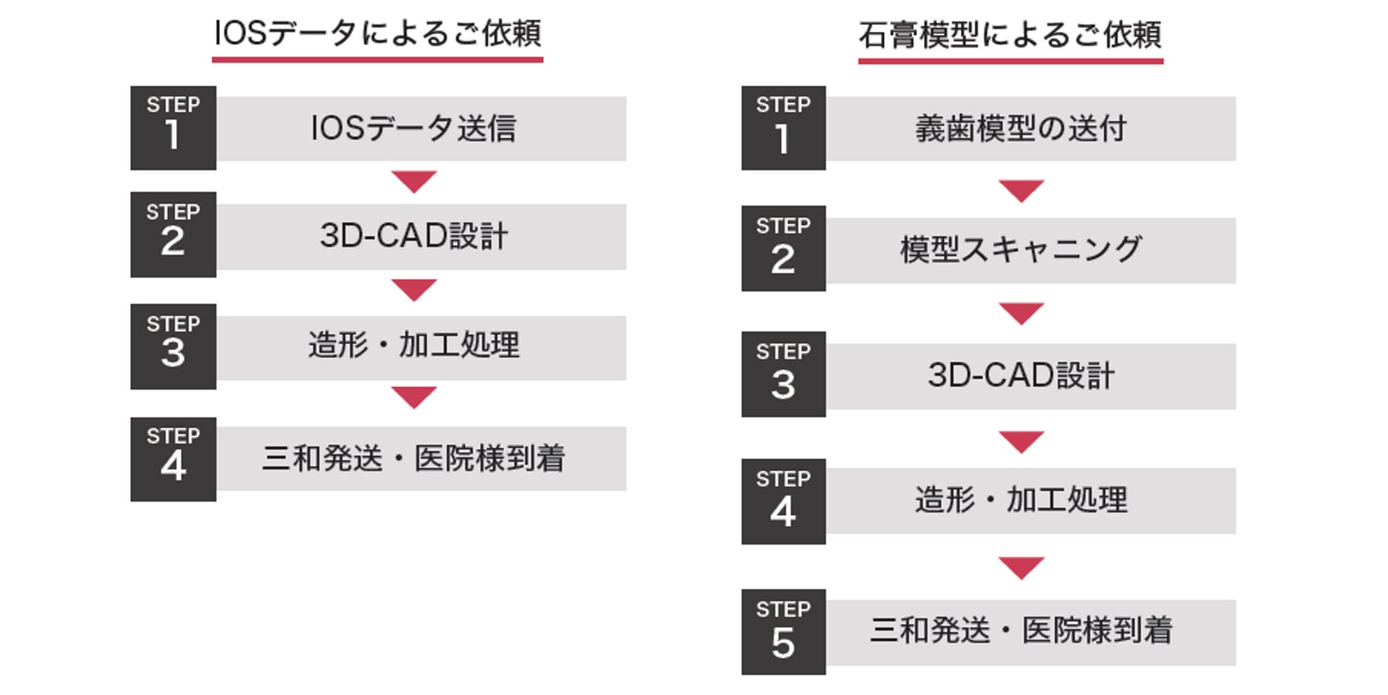 Livionの製作は、医院様の環境に合わせて柔軟に対応可能です。まず歯科医院様からiOS(口腔内スキャナー)データ、または従来の石膏模型をお送りいただきます。iOSデータの場合、スキャンしたデータをもとに、デジタル上で精密な作業模型を再現します。