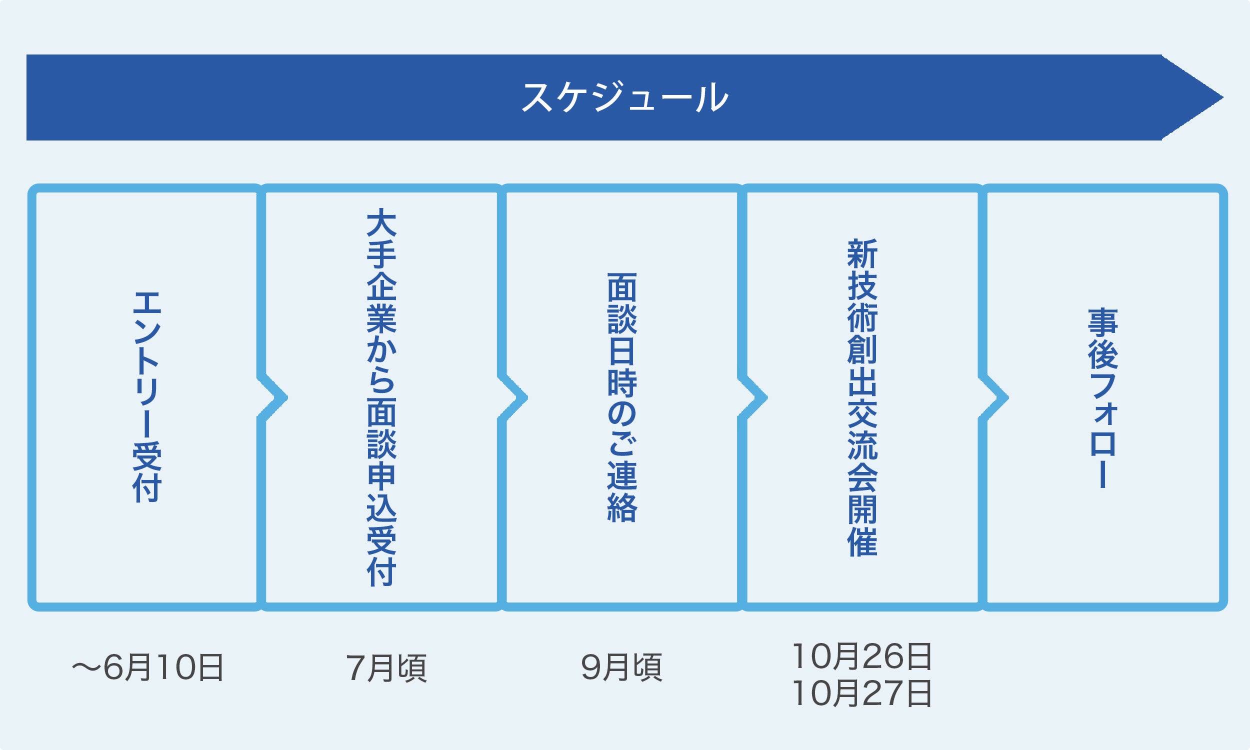 ※エントリーいただいても、大手企業等から10/26・27の面談申込(指名)が無い場合は新技術創 出交流会にご参加いただくことができません。予めご了承ください。