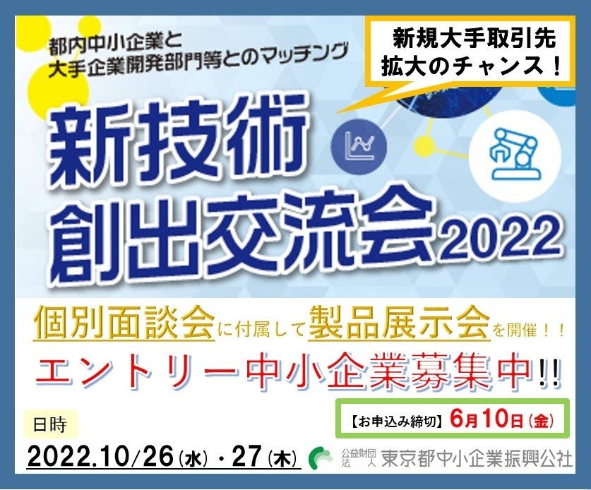「新技術創出交流会2022」の募集説明及び「技術アピールシート」のより効果的な記入方法や大手企業の着眼点・活用状況についてご案内する募集説明会を開催します。