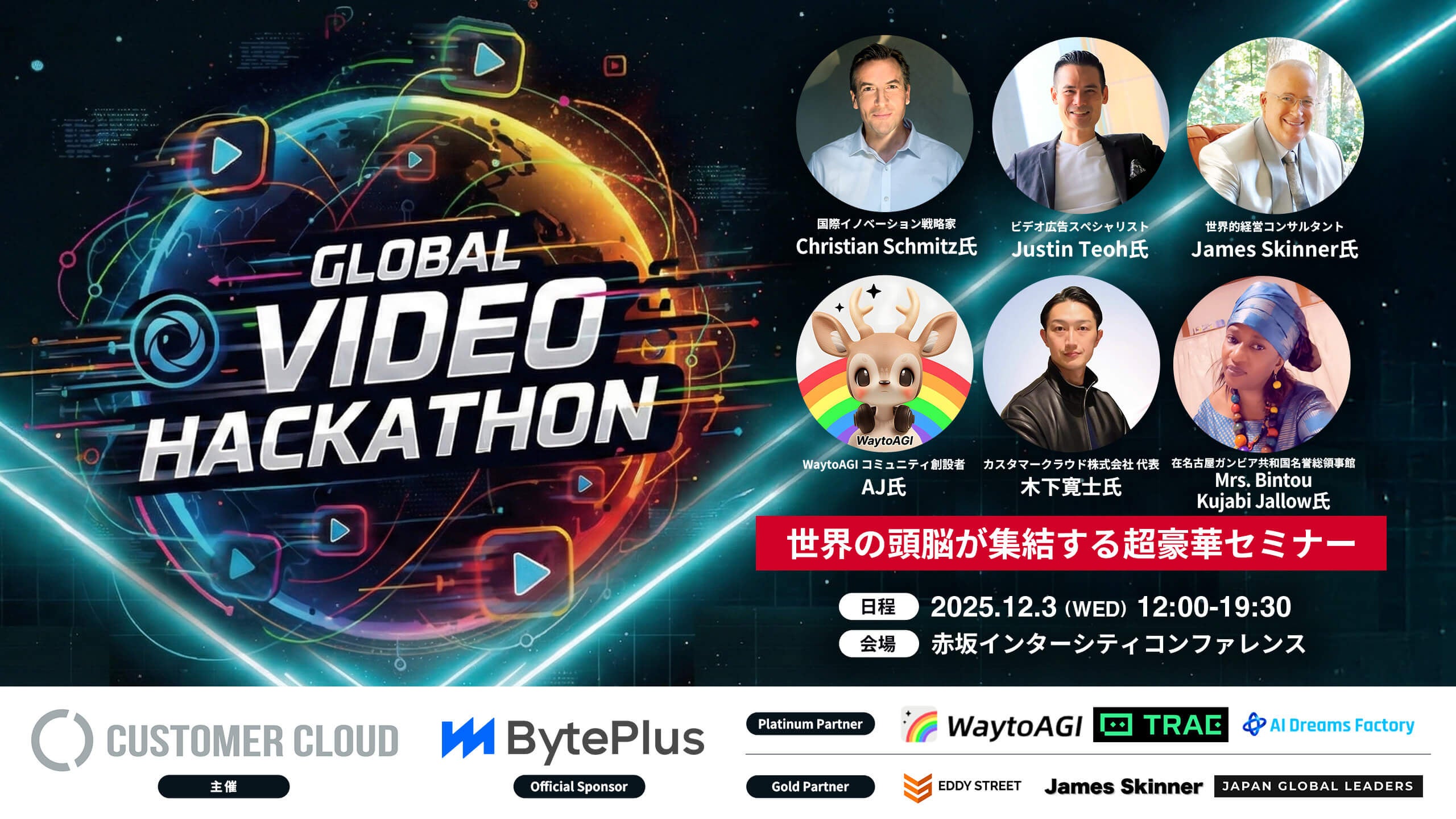 「Global Video Hackathon 2025」は、世界最大級のAI基盤を提供する BytePlus、次世代AI開発環境として注目される TRAE、そして 900万人の会員を擁する世界最大級AIコミュニティ WaytoAGI と連携し、世界中のクリエイターやエンジニアが参加する国際AI映像ハッカソン(運営:カスタマークラウドメディア事業部)です。