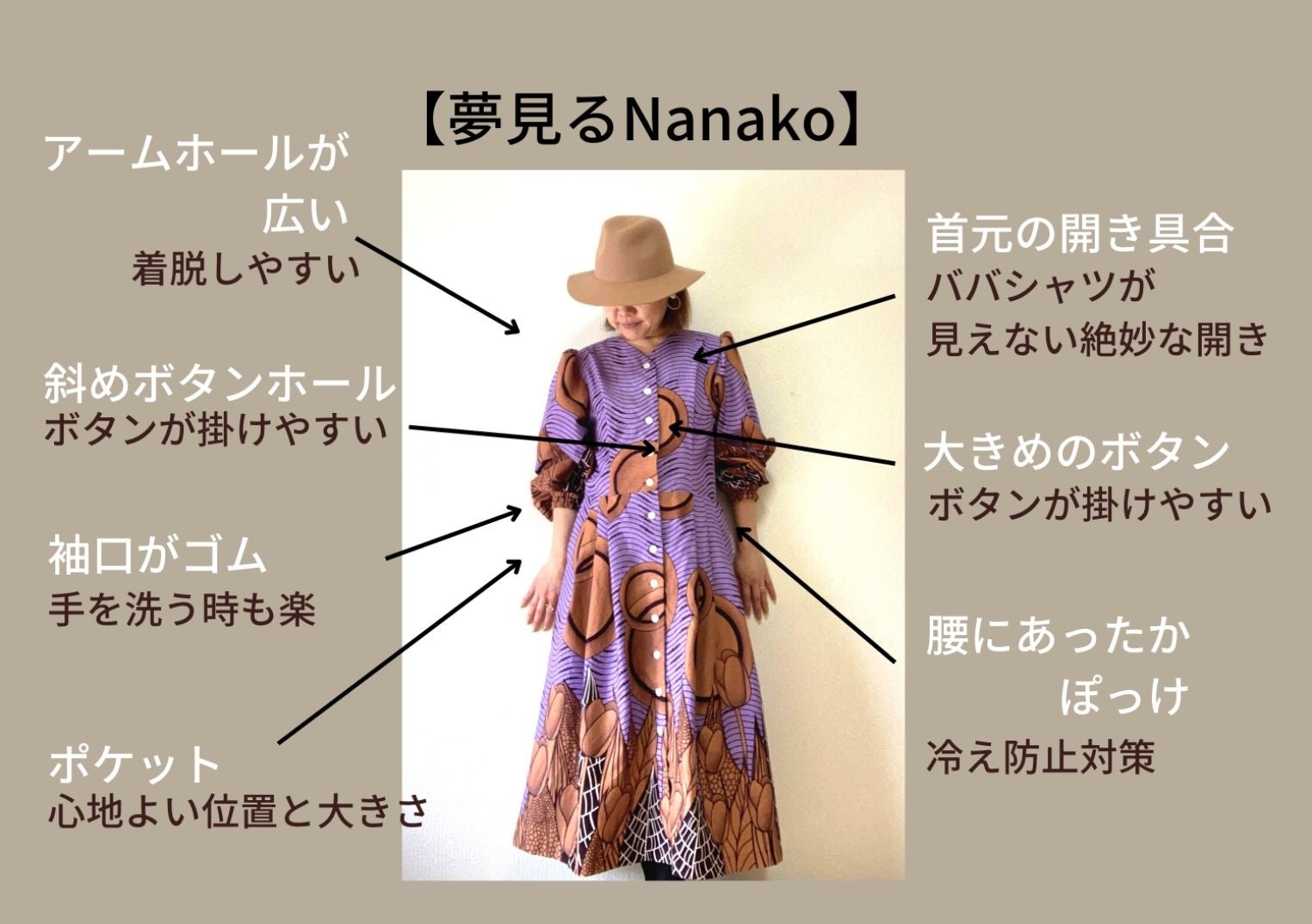 グランマの皆さまが気軽に出掛けられる機能を組み込んだ洋服です。例えば、アームホールを広くして着脱が楽にできるようにしていたり、ボタンホールを斜めに、使い捨てカイロが入れられるあったかぽっけをつけています。誰もが唯一無二の存在であることから、世界で1着しかお作りしません。