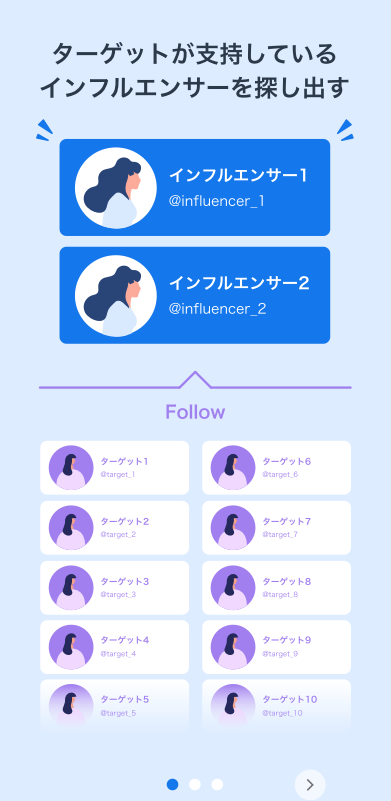 上記のようなケースの場合、ターゲットは「競合他社のアカウントをフォローしている人」と定義することができます。競合他社のアカウントをフォローしている人達が「共通してフォローしているインフルエンサー」を探すことができれば「競合他社の商品を一度でも買ったことのある人」に限りなくPRを届けることが可能です。