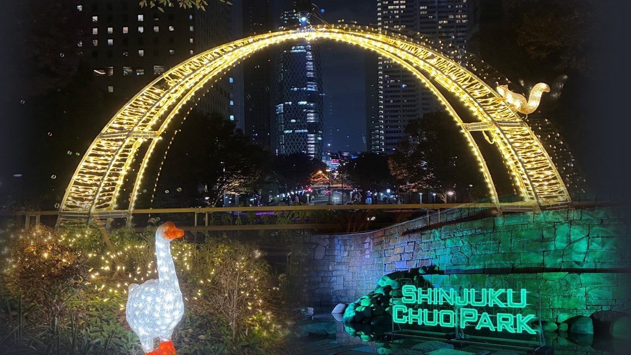 新宿中央公園のファンモアタイムひろば、眺望のもりを舞台に展開するイルミネーションイベント「TWINKLE PARK」。公園の木々や滝は光で飾られ、光で彩られた公園と新宿の夜景のフォトジェニックな景色をお楽しみいただけます。公園のシンボルであるナイアガラの滝のライトアップでは、色を変えられる仕掛けもございます。