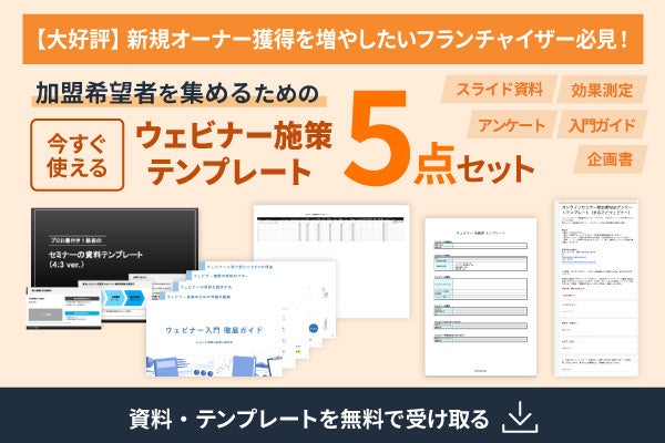 昨今、フランチャイズ業界の加盟店募集において、対面の説明会に加え「オンライン事業説明会(ウェビナー)」が主流になりつつあります。全国から加盟希望者にアプローチできる一方で、本部の開発担当者からは「魅力的な説明会スライドが作れない」「参加者は集まるが、具体的な加盟検討につながらない」「開催までの準備や当日の運営フローが定まっていない」といった悩みが尽きません。 そこで当社は、数多くの法人ウェビナーを支援してきたノウハウをベースに、FC本部様がすぐに実務で活用できる実用的なテンプレート5点セットを作成いたしました。