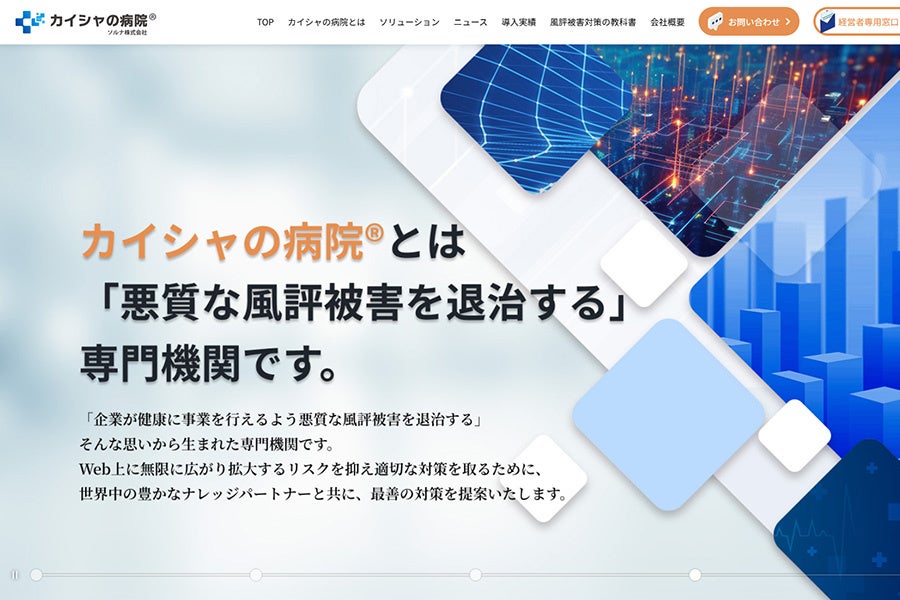 ソルナは創業以来、「会社の病院®」をコンセプトに掲げ、ネット上で発生する風評や誹謗中傷に対し、被害発生前の予防から発生後の対応までを一貫して支援する体制を構築してきました。