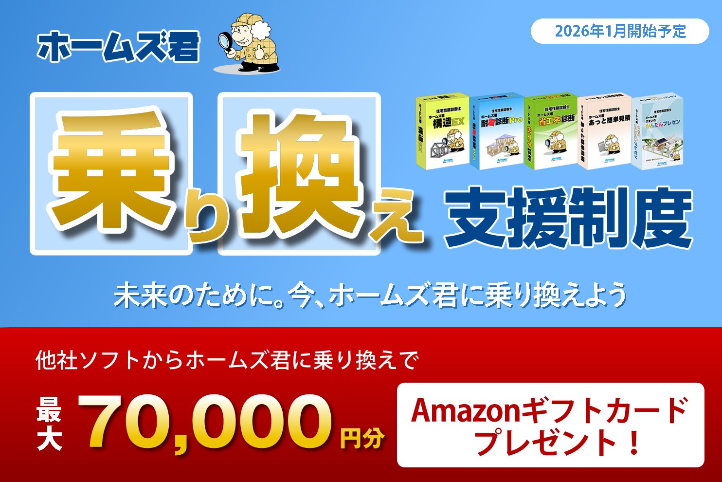 現在、他社製の初期プレゼンソフト、構造計算ソフト、省エネ計算ソフト等をご利用中のお客様を対象に、ホームズ君シリーズのご購入金額に応じて、最大70,000円相当のAmazonギフトカードを進呈いたします。