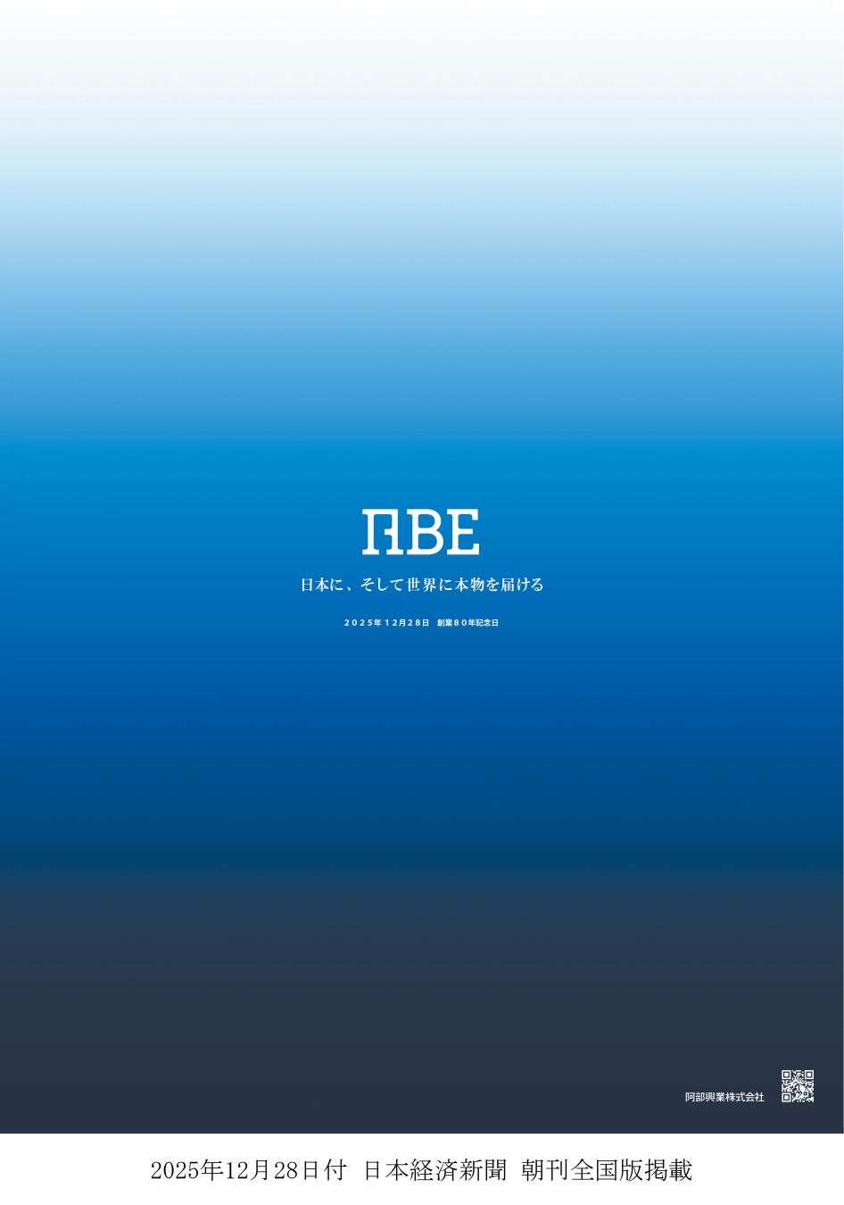 阿部興業株式会社(ABE)(新宿区、社長 阿部清光)は、創業80周年の記念日である2025年12月28日付の日本経済新聞朝刊に、企業広告を出稿・掲載いたしました。