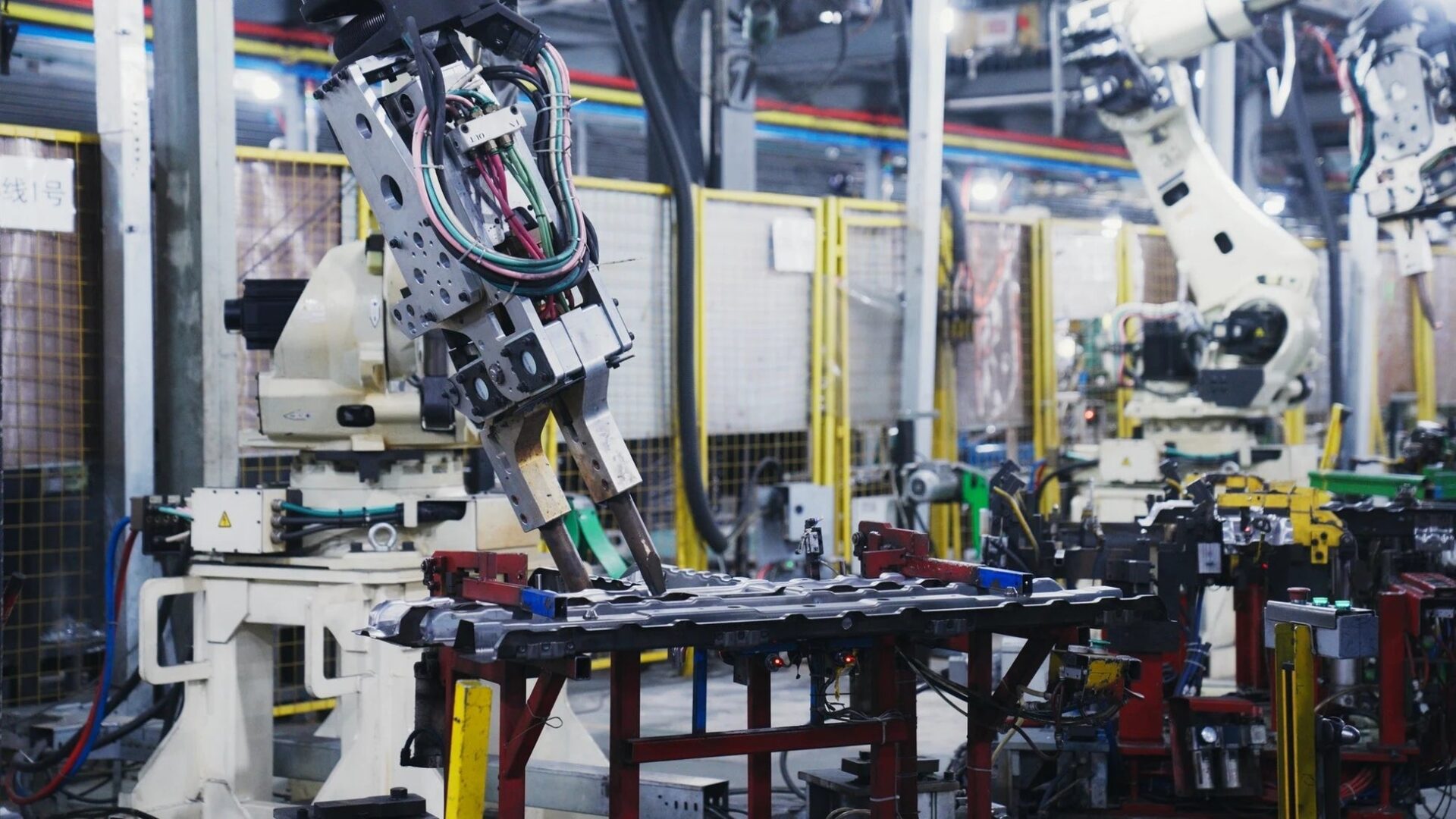 Liuzhou Yinrui Automotive社の製造工場内には、高速産業用溶接ロボットが整然と並んでおり、現代の自動車生産に求められるスピードと精度を物語っています。