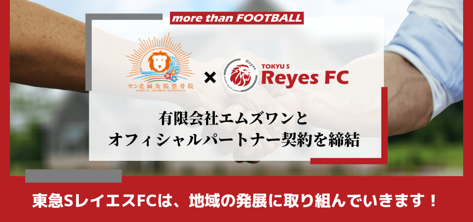有限会社エムズワン様が運営するセン北鍼灸院整骨院から経験豊富なスタッフを東急SレイエスFCのトップチームへ派遣いただき、主にメディカルの部分でチームをサポートしていただくこととなりました。有限会社エムズワン様ならびにセン北鍼灸院整骨院スタッフの皆様と共に、神奈川県社会人リーグ2部リーグへの昇格へ向け、更なるパフォーマンス向上に取り組んで参ります。