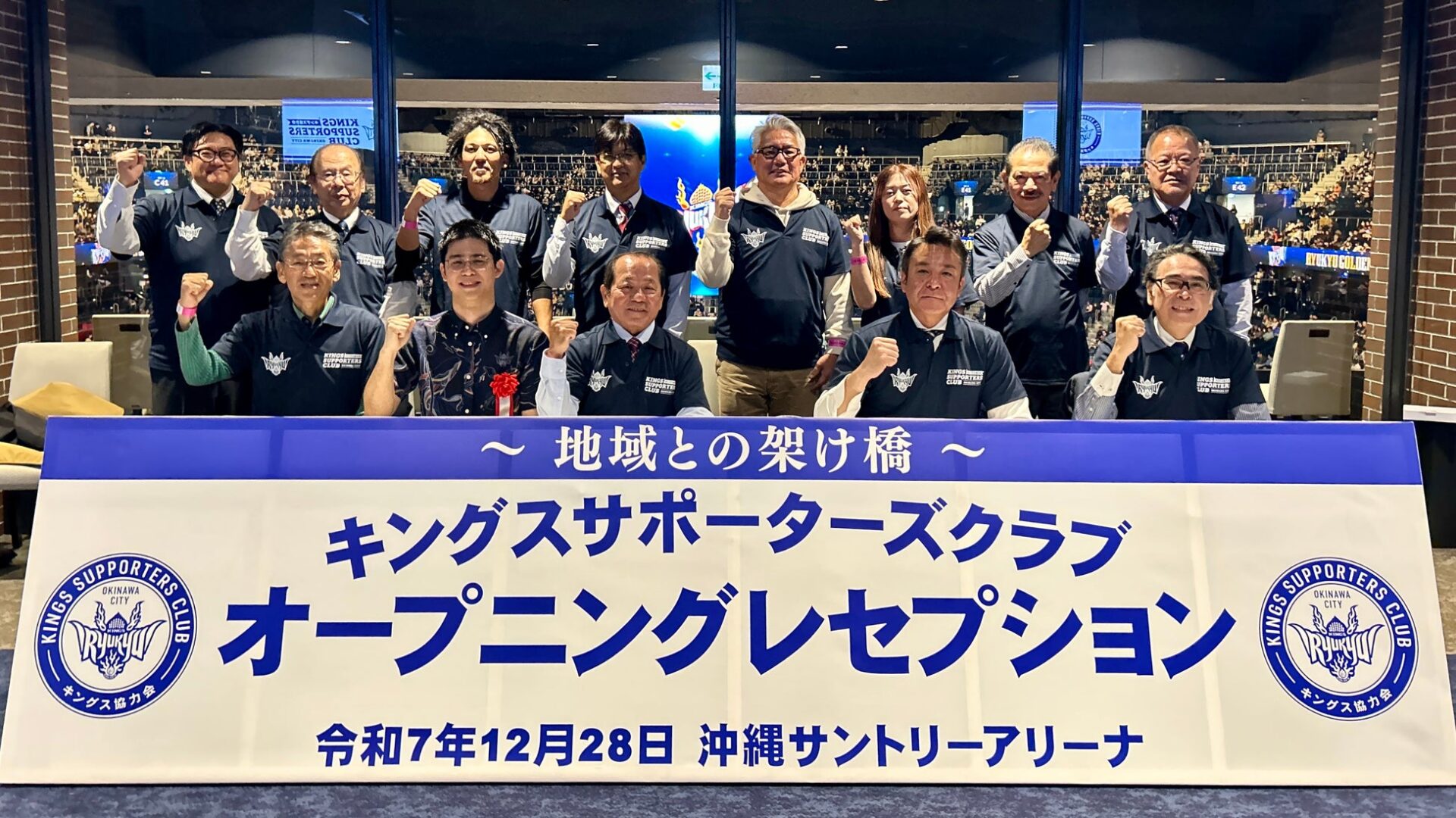 キングスサポーターズクラブは、地域社会とキングスの“架け橋”となることを掲げ、単なるチーム支援に留まらず、スポーツを通じた地域活性化、経済発展、そして次世代を担う子どもたちへの夢の継承に寄与することを目的とし、10月23日に設立されました。12月28日(日)の仙台89ERSとの試合前には、オープニングレセプションが開催され、キングスサポーターズクラブの宮里敏行会長、花城大輔沖縄市長、瑞慶山良一郎 沖縄市議会議長、沖縄バスケットボール株式会社 代表取締役社長の仲間陸人らが出席しました。
