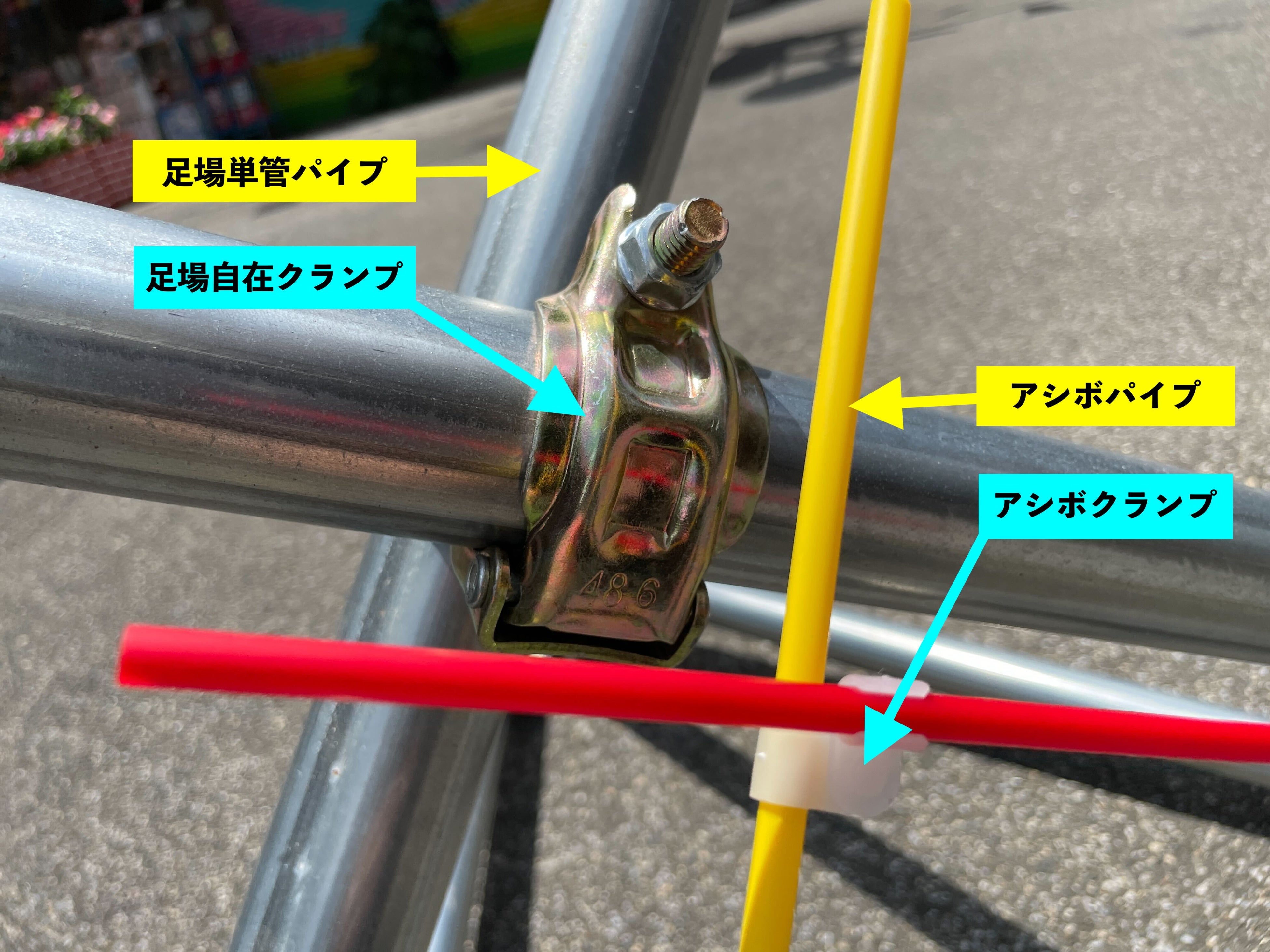 ③角度を変えたり、アシボパイプの長さを変えたりします。アシボクランプで自由な角度がつけられるため、どんな形でも作れます。