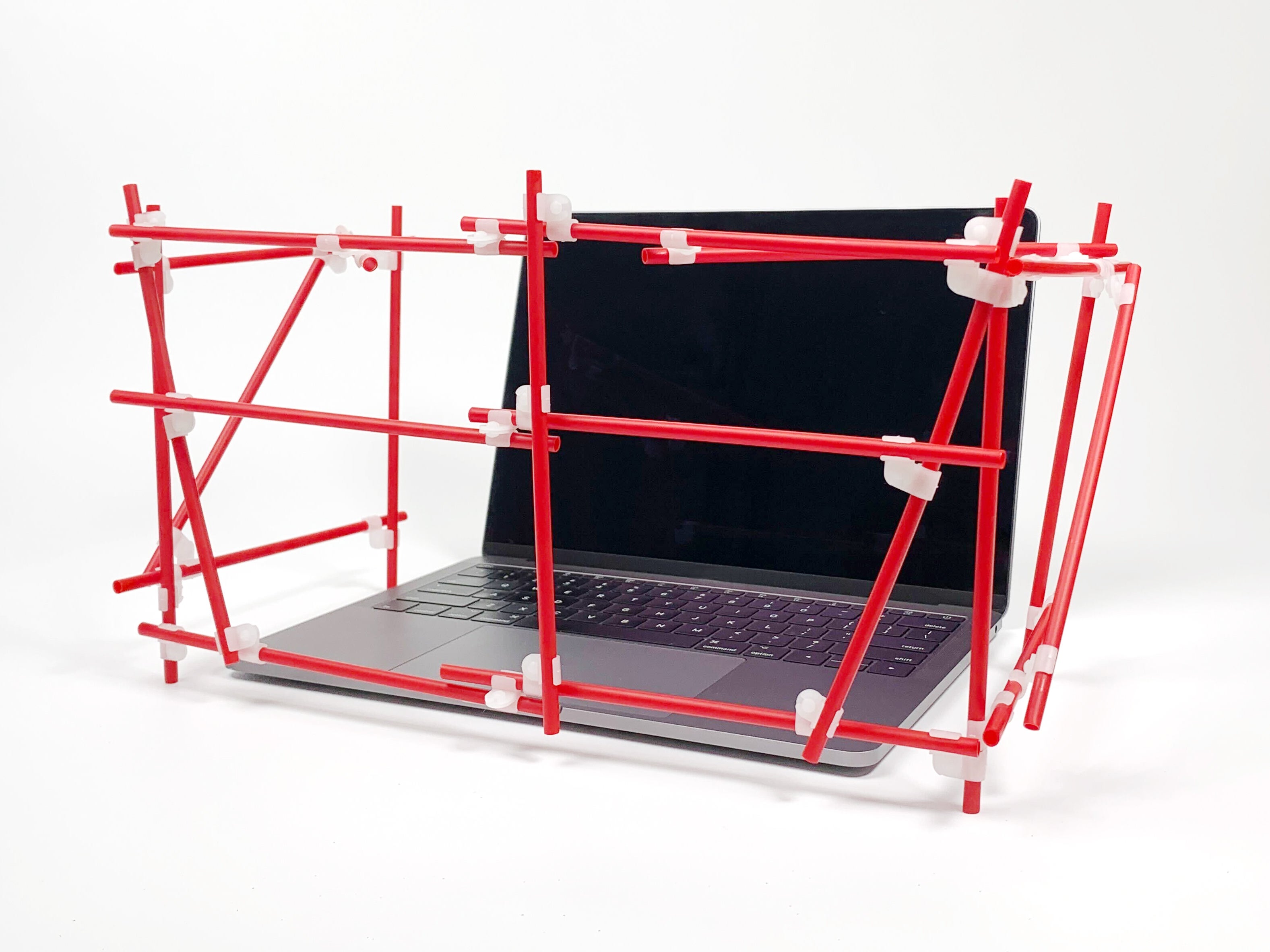 ①まずは足場作りで基本を練習してみましょう。お家にあるいろいろなものを建造物に見立てて、足場で囲むと、なんだか笑えてきて、癖になります。何でも囲んで、写真をSNSなどに投稿してみましょう。これにより基本的な立体物の作り方がわかります。