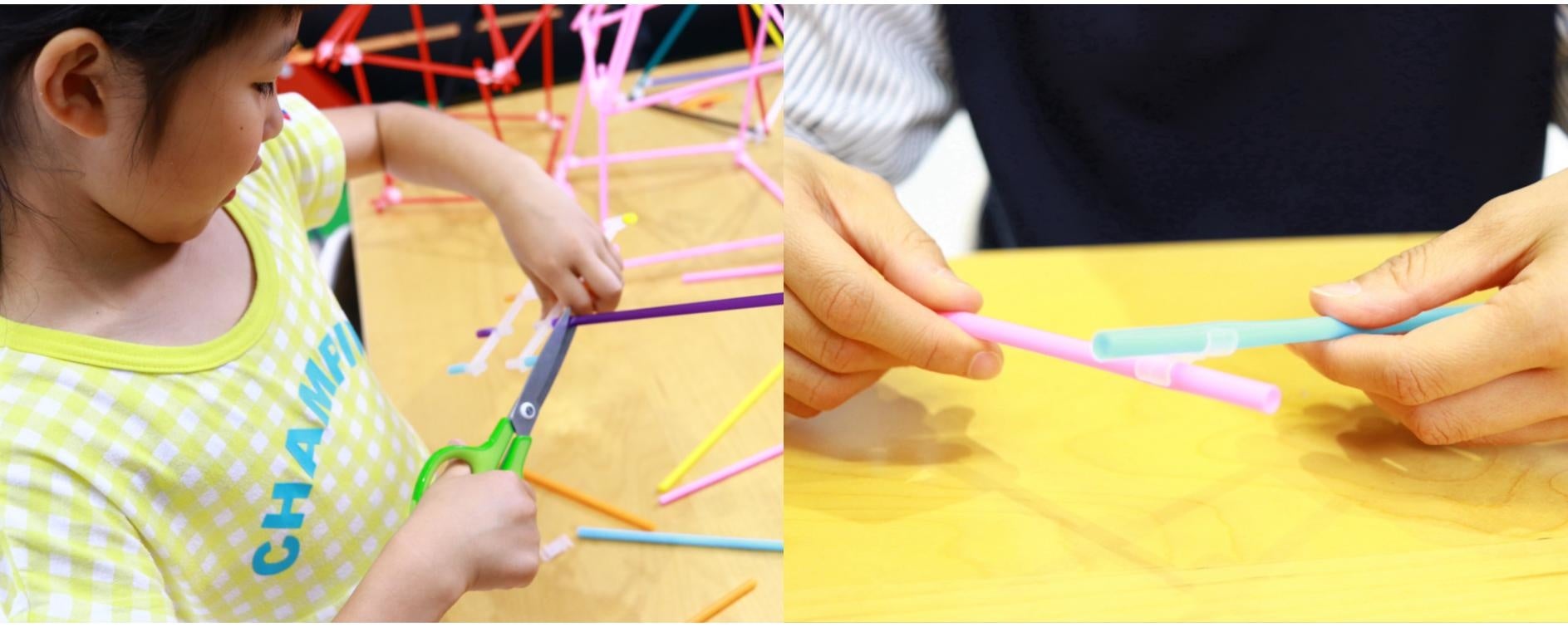 先日、実施したアシボのワークショップ、シンプルな2つのパーツだけですがストローに、ジョイントをはめるとだけを伝えるとその後は、夢中で思い思いの作品を作り始めてくれました。