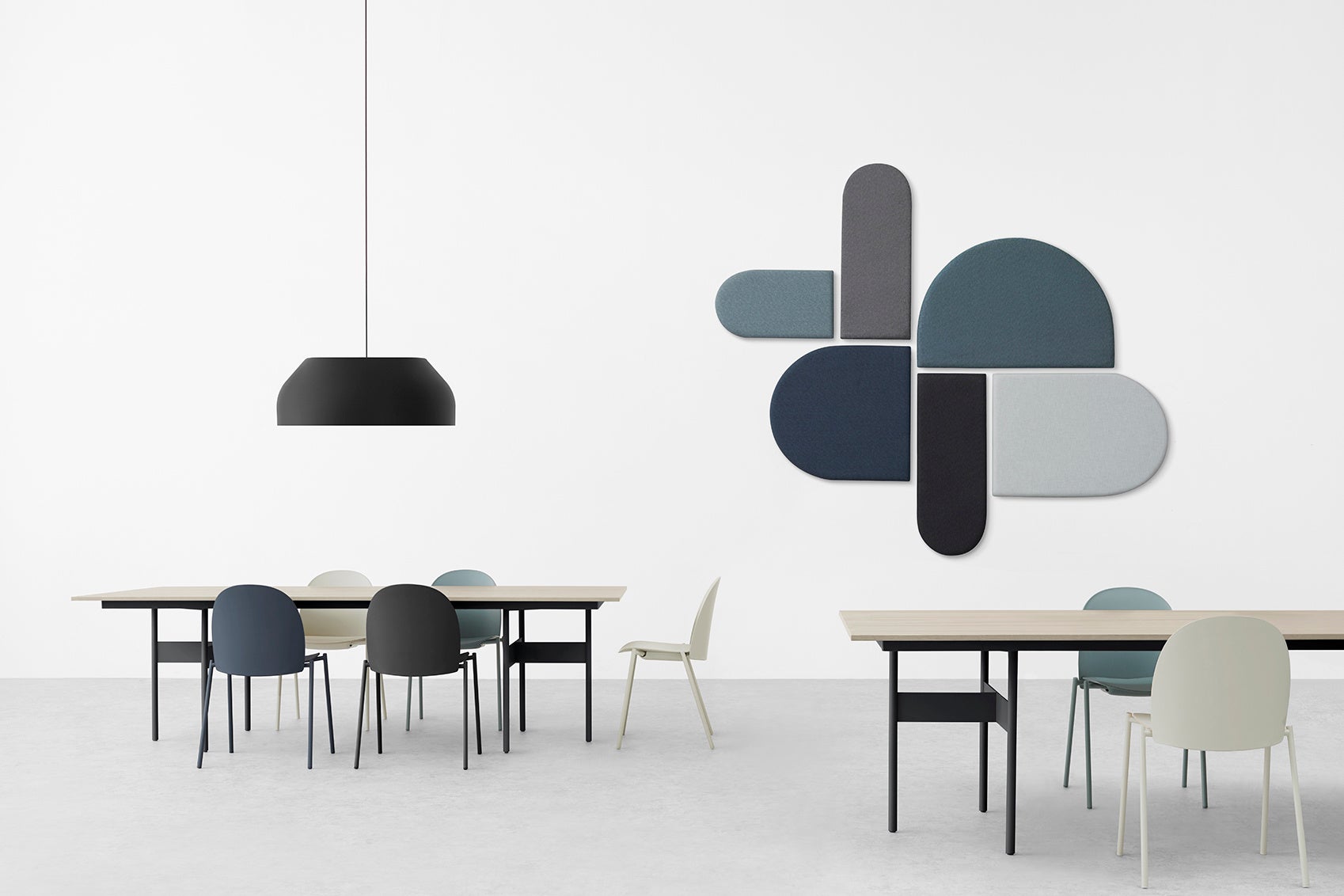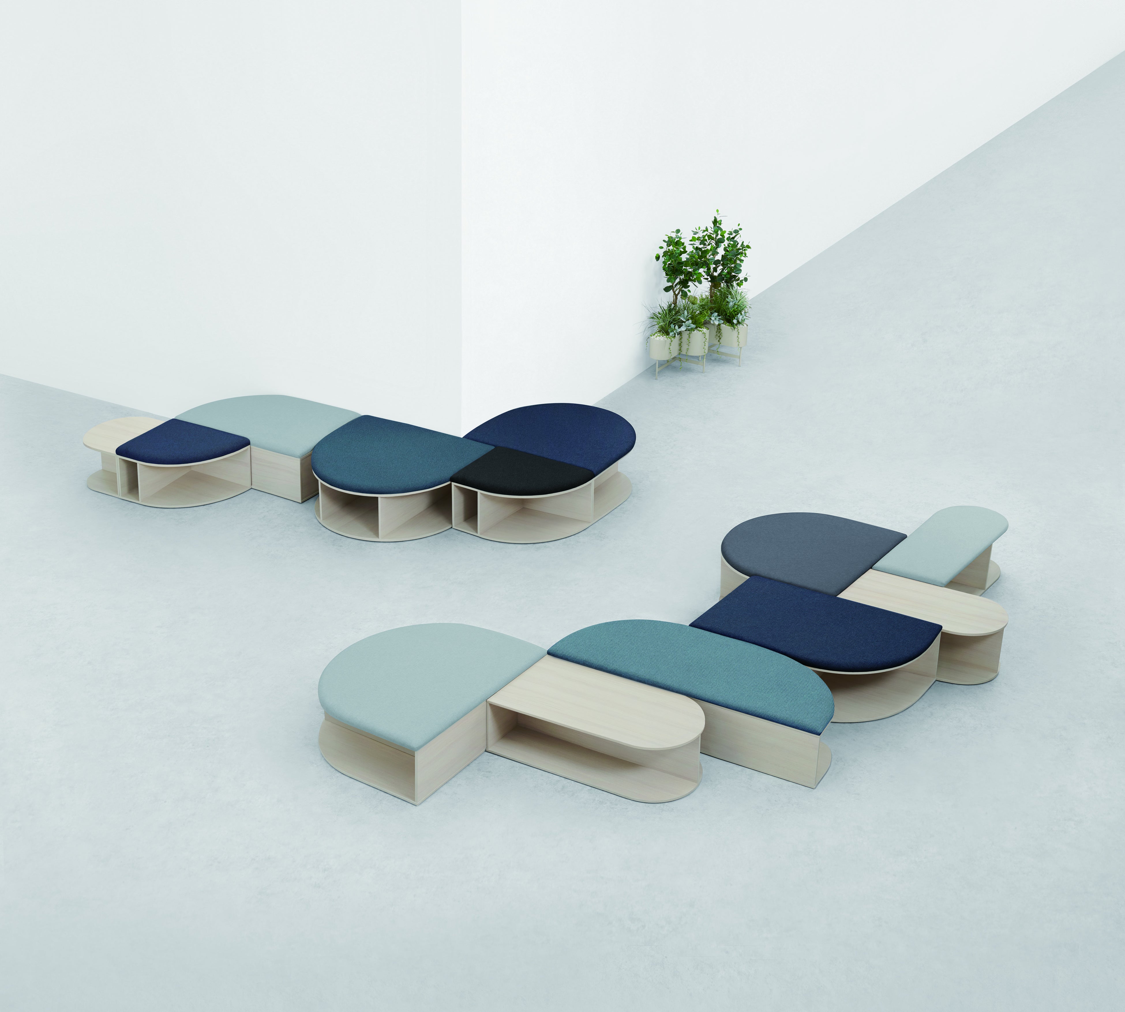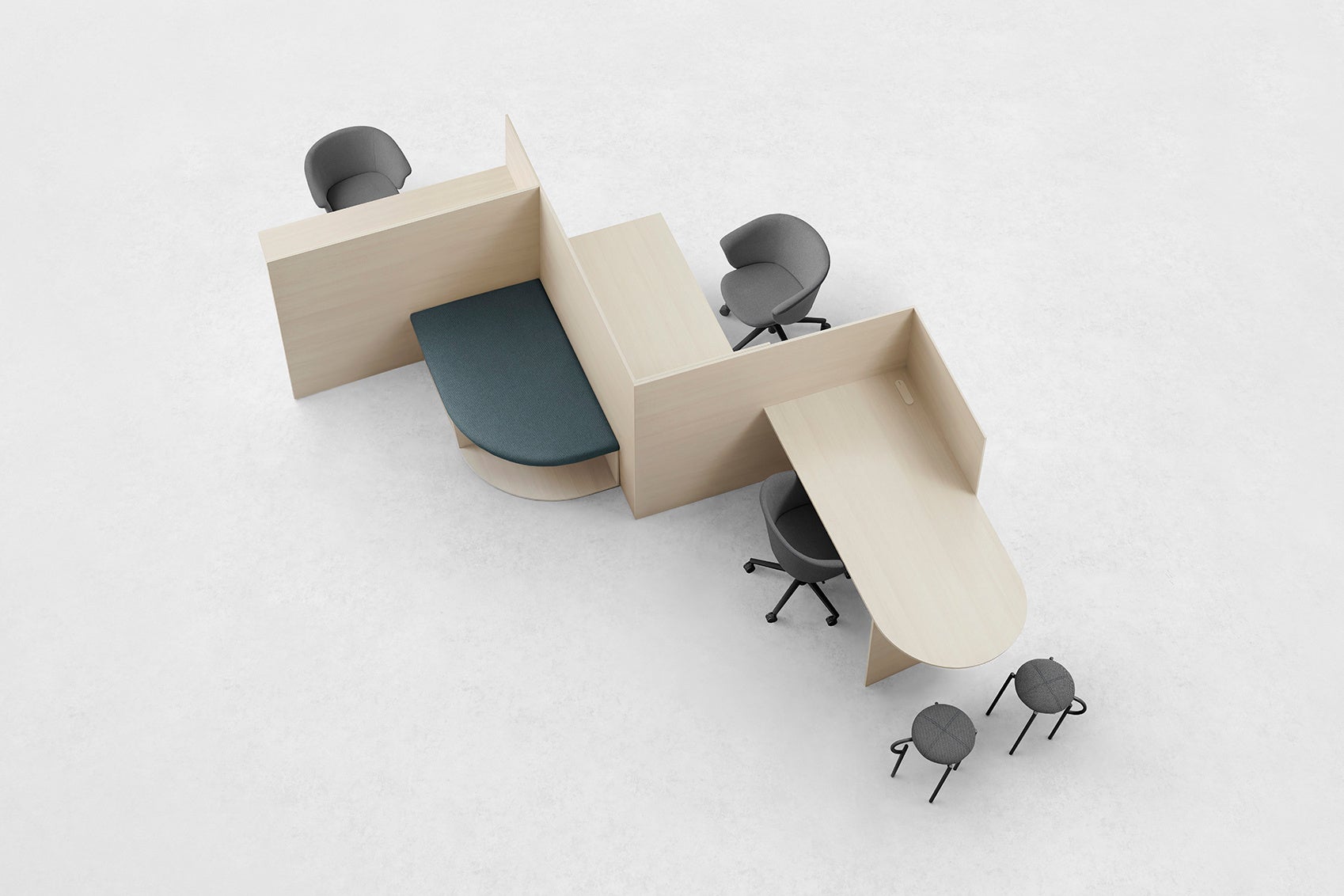 ・enKAKのアイテム数は300におよび、「en(円)」と「KAK(角)」を用いて、デスクやソファ、ブースやテーブルといった性質の異なるアイテムを自由に設置・組み合わせることが可能に。従来切り分けられていた「集中」や「コミュニケーション」といった異なる要素を融合させることができ、働く場に新しい価値を生み出します。