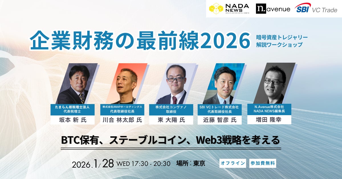 N.Avenue株式会社(本社:東京都港区、代表取締役 CEO:神本侑季)は、暗号資産を企業財務に取り込むための実務論点を整理する完全招待制ワークショップ「企業財務の最前線2026 ー BTC保有、ステーブルコイン、Web3戦略を考える」を、2026年1月28日(水)に開催します。