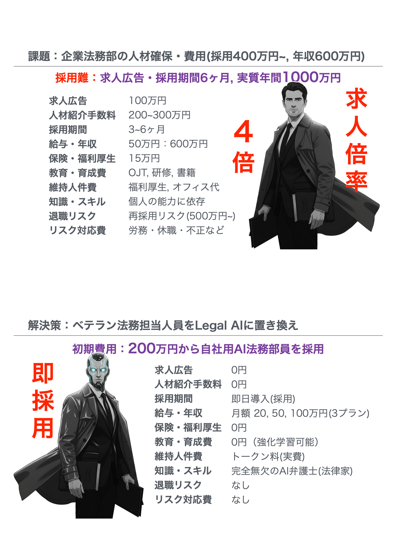 「法務担当者が採用できない」「育った頃に辞めてしまう」――そんな経営課題を、最強のテクノロジーで解決します。