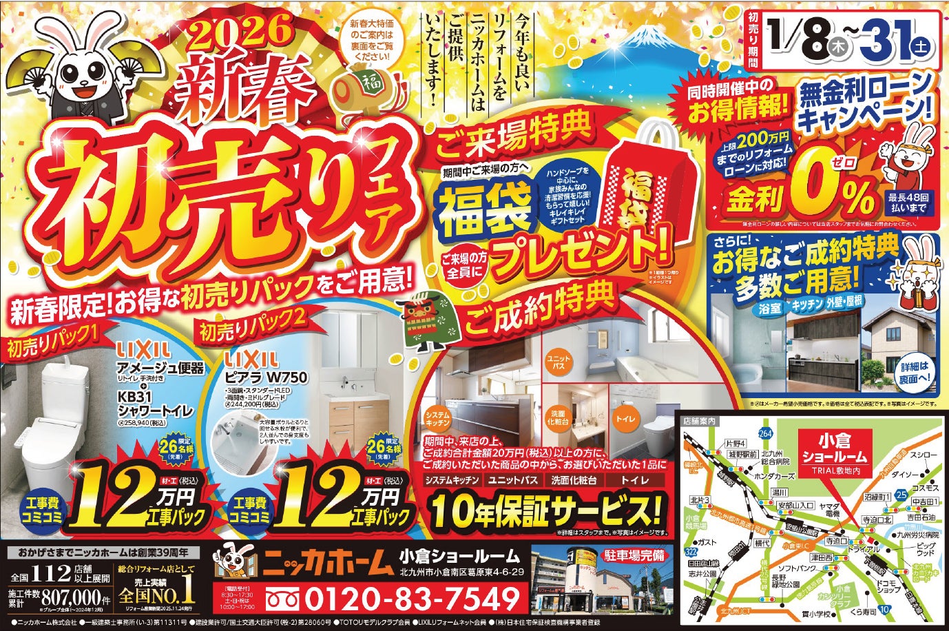 全国100店舗以上展開!2026年に創業39周年を迎える、リフォーム&増改築 ニッカホーム株式会社 (本社:愛知県名古屋市緑区篭⼭、代表取締役社長:西田裕久、以下 ニッカホーム)の小倉エリア・ニッカホーム小倉ショールーム にて、26年1月8日より「新春初売りキャンペーン」を開催します!