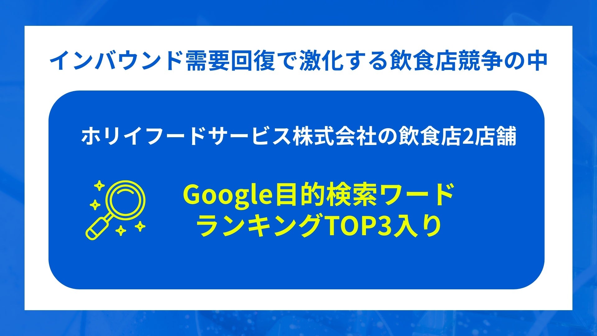 ホリイフードサービス株式会社(本社:茨城県水戸市、代表取締役社長:藤田 明久、以下ホリイフードサービス)が展開するインバウンド向け飲食店舗2店舗が、Google目的検索ワードにおいて主要キーワードで相次いでランキング上位(TOP3)にランクインしました。