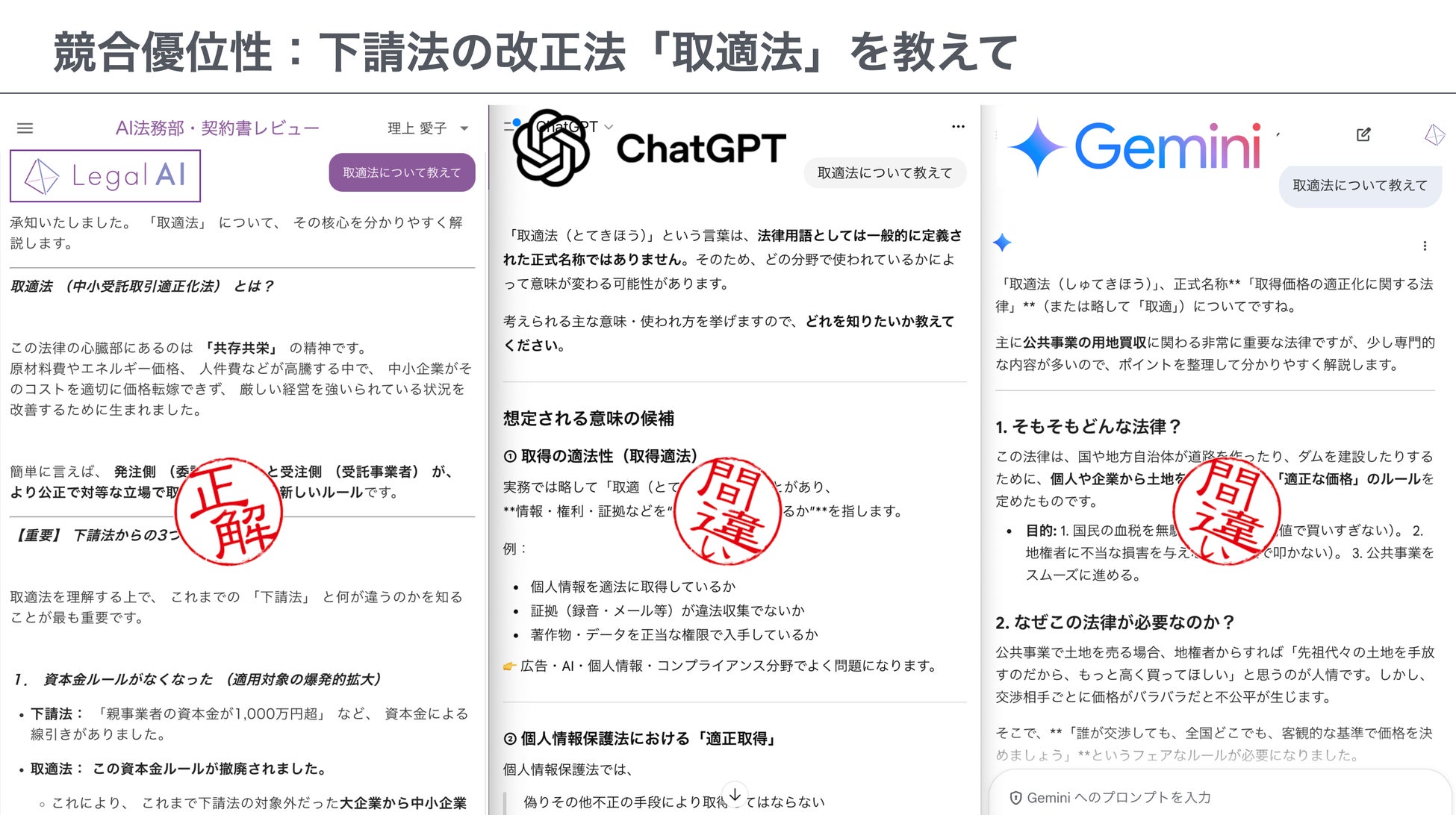 最新法令への即応: 成立・公布されたばかりの法律や、今後出される政令・公取委規則をリアルタイムで学習・反映します。適法性の確保: 弁護士法72条に配慮し、最終的な法的判断ではなく、条文やガイドラインに基づく「情報提供・論点整理」に特化しています。