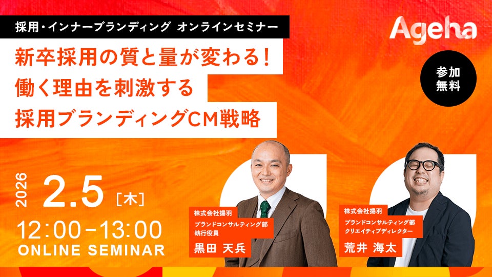 コーポレートブランディング支援を行う株式会社揚羽(東京都中央区 代表取締役社長:湊 剛宏 証券コード:9330)は、2026年2月5日(木)に「新卒採用の質と量が変わる!働く理由を刺激する採用ブランディングCM戦略」と題したセミナーを、オンラインで開催します。