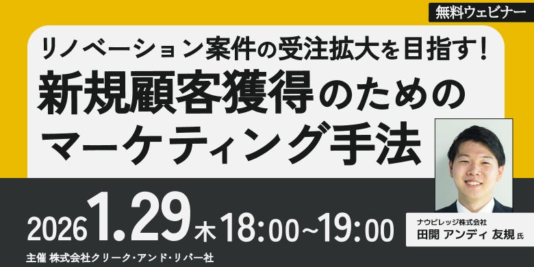 株式会社クリーク・アンド・リバー社(C&R社)は1月29日(木)、リフォーム・リノベーションを手掛けている、もしくは関心のある企業の方に向けた無料のオンラインセミナー「リノベーション案件の受注拡大を目指す!新規顧客獲得のためのマーケティング手法」を開催します。