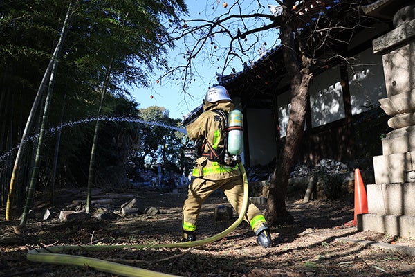 訓練は、消防隊員、同寺関係者ら約10人が参加し、自動火災報知設備のベル鳴動を合図に開始。本堂の祭壇からの出火を想定し、同寺関係者が119番通報を行った後、文化財の搬出訓練や消火器を使用した初期消火訓練が行われました。その後、通報を受けた消防隊員らが計2台の消防車で現場に到着し、放水による消火活動を実施しました。訓練後、市消防本部による講評が行われ「日頃から初期対応や文化財の搬出手順を確認しておくことが、被害を最小限に抑えることにつながります。今日の訓練を今後に生かしていただきたい」と貴重な文化財を後世へ引き継いでいくために同寺関係者へ火災予防を呼びかけていました。