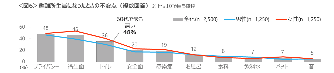 避難所生活になった場合の不安点は「プライバシー」「衛生面」「トイレ」の3つが目立つ。女性は「衛生面」と「トイレ」をあげている人が特に多い。また、60代の一番の不安点は「トイレ」で、48%であった。<図6>