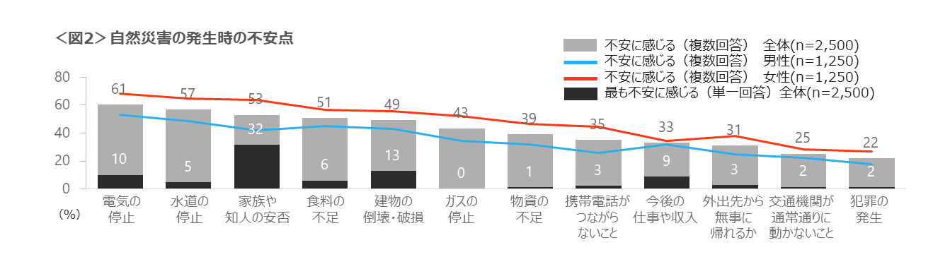 災害が発生した場合に不安に感じる点は、「電気の停止」「水道の停止」「家族や知人の安否」「食料の不足」「建物の倒壊・破損」が5~6割と多い。そのうち、最も不安に感じる点は、「家族や知人の安否」である。特に女性で不安に感じる割合が高い。<図2>