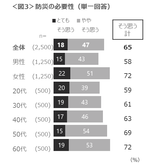 防災の必要性を感じるかの設問に対し「とてもそう思う」18%、「とても+ややそう思う」は65%におよぶ。年齢が高くなるほど必要性の意識は強まる。<図3>
