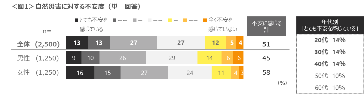 自然災害への不安度を7段階で聴取をした。「とても不安を感じている」は13%、「不安に感じる計」は51%と半数を占めた。不安度は、特に女性や若い世代で高い。<図1>
