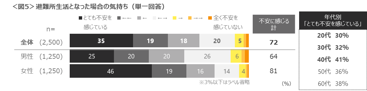 避難所生活となった場合の気持ちを7段階で確認した。「とても不安を感じる」は35%、「不安に感じる計」は72%に達する。女性や40代は「とても不安を感じる」が4割を超える。<図5>