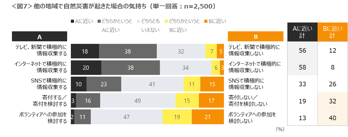 他の地域で災害が起きた場合、「テレビ・新聞」「インターネット」で積極的に情報収集する人は6割に近い。一方「寄付をする/検討する」「ボランティア参加を検討する」は2割を下回る結果であり、”検討しない”人の方が多い。<図7>