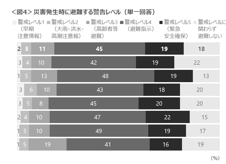 災害発生の恐れがある場合、どの警戒レベルで避難するかを聴取した。「警戒レベル4(避難指示)」で避難するは45%、次いで「警戒レベル5(緊急安全確保)」の19%、合わせて64%におよぶ。60代は「警戒レベル3(高齢者等避難)」の段階で避難する人が19%と早めに避難するとした人が多い。一方、「警戒レベルに関わらず避難しない」は18%を占めた。<図4>