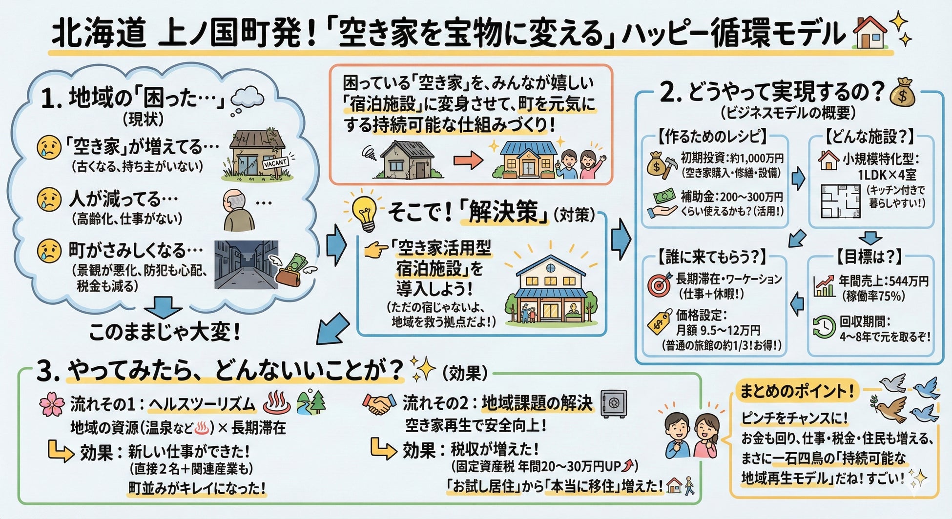 上ノ国町での実践モデル(空き家約100室活用プロジェクト)をベースに、観光振興・関係人口創出・税収増の持続可能な循環を設計