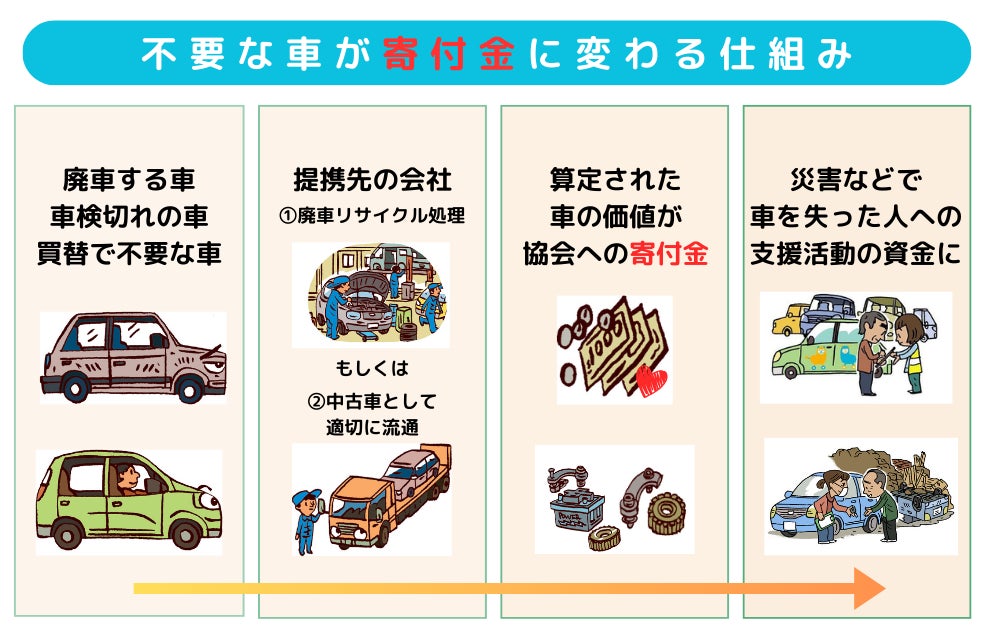 今回初めての取組として、リサイクル会社と連携を強化し、期間中に限り、通常の査定額に最大5,000円を上乗せする取組みも行います。全国から「100台」の車両と総額「420万円相当」の寄付を集め、被災地および生活にお困りの方への支援の大幅な強化を目指します。