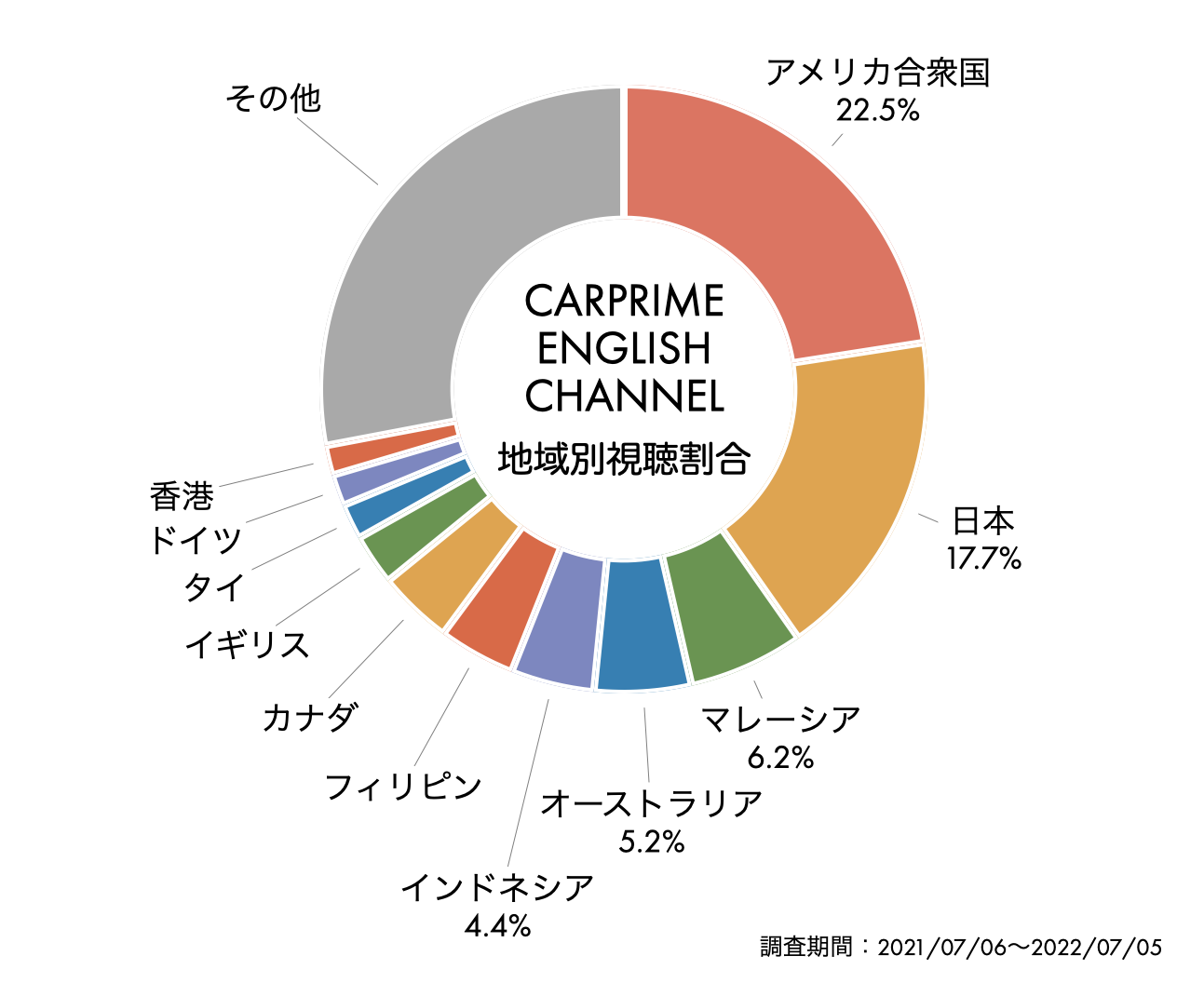 地域別では最も視聴回数が多いのがアメリカ合衆国で、全体の22.5%を占めます。米国に次いで日本、マレーシア、オーストラリア、インドネシア、フィリピンと東南アジア諸国で人気の傾向があるようです。その他、カナダやイギリスなどでも視聴されています。平均視聴時間は7分以上という結果になりました。(調査期間:2021/07/06〜2022/07/05)