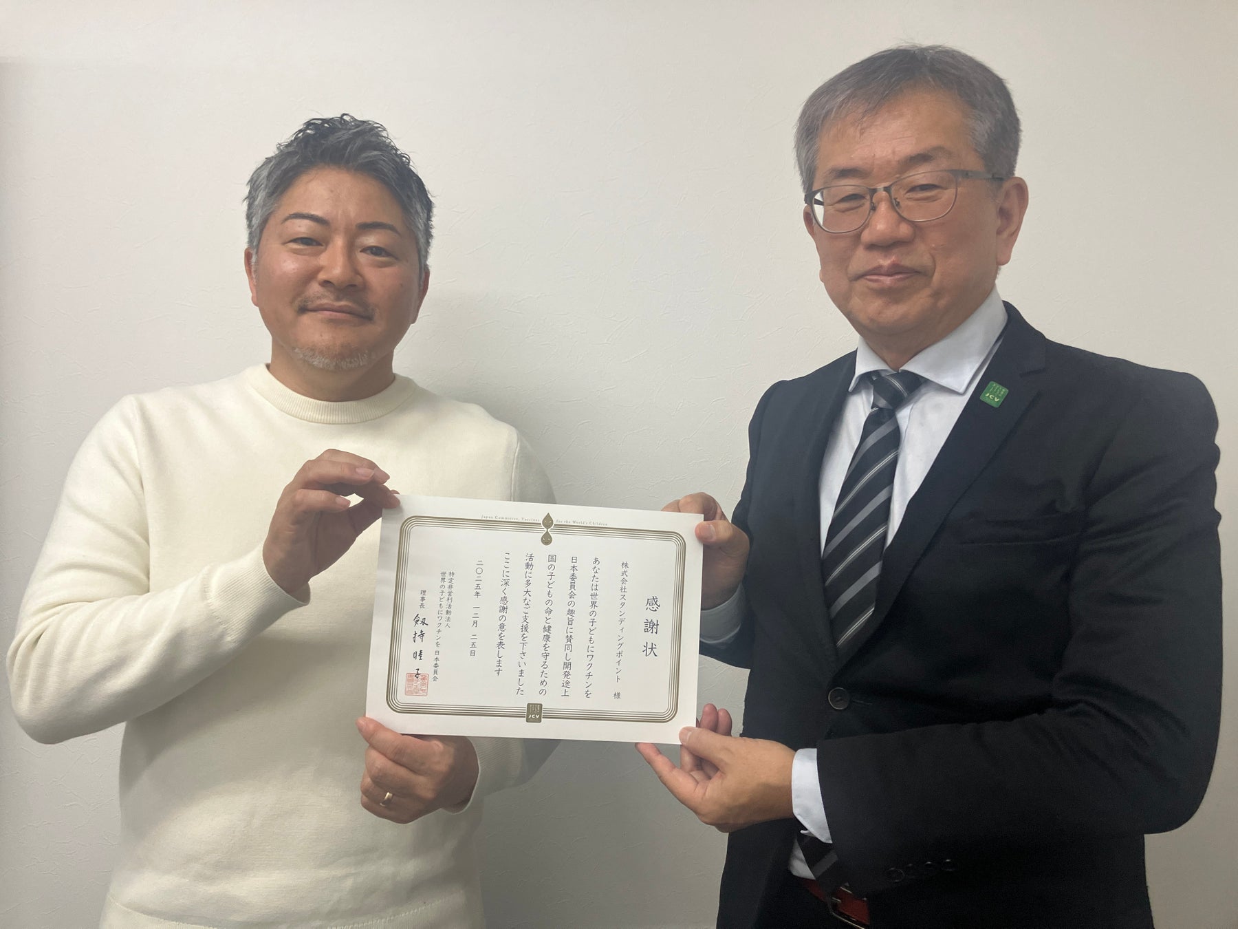 このたび、JCVの事務局長および高橋様がスタンディングポイント本社に来社され、長年にわたるワクチン寄付活動への感謝状を代表して受領いたしました。