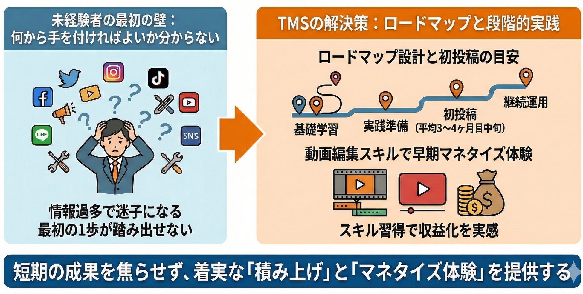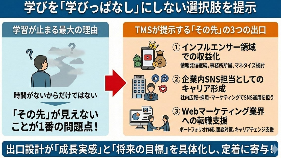 東京マーケティングスクール(TMS)は、この改善余地に対して、SNS学習を軸にしながら日々の行動が積み上がる環境を提供し、定着リスクの低減を狙います。