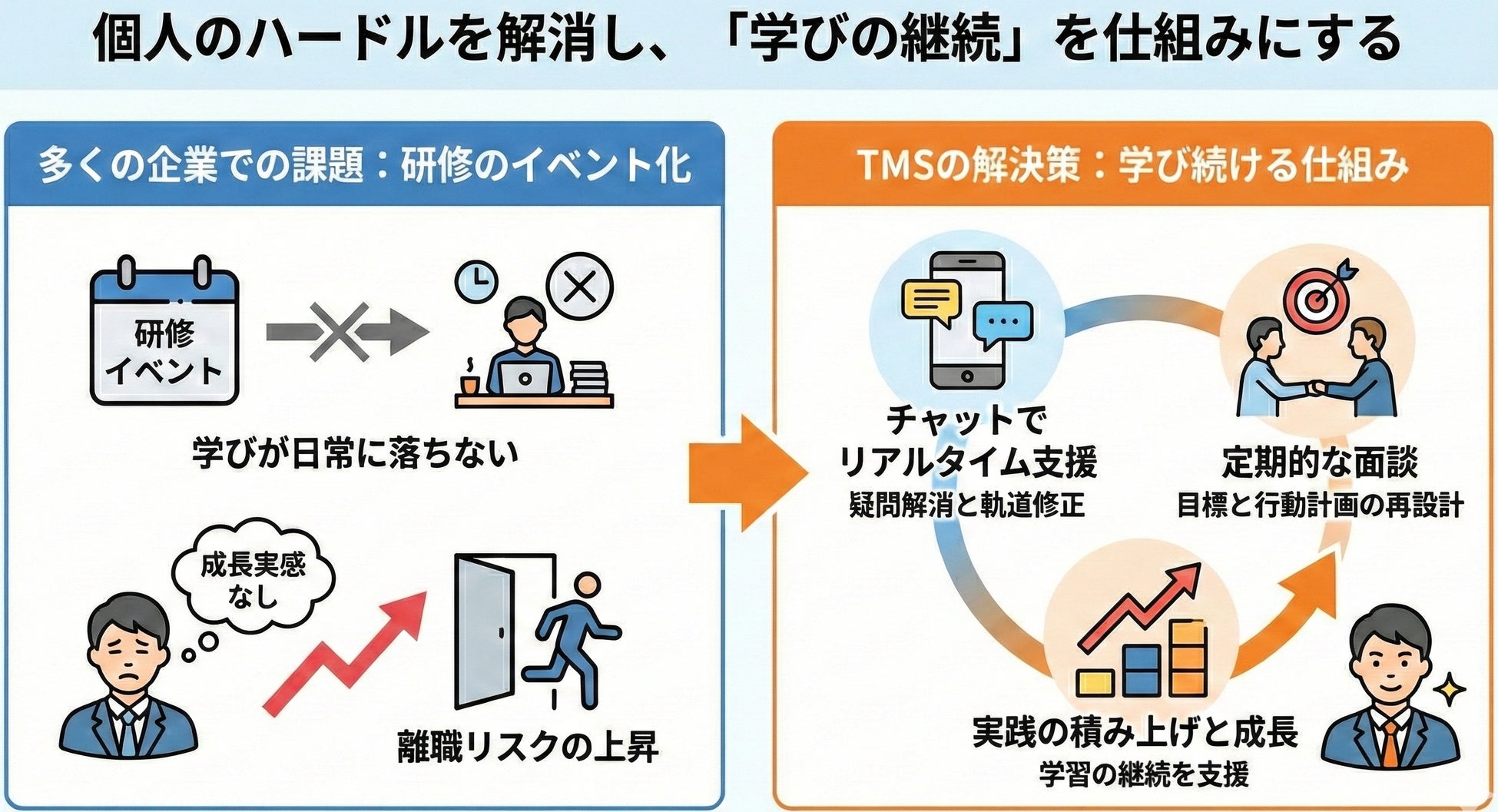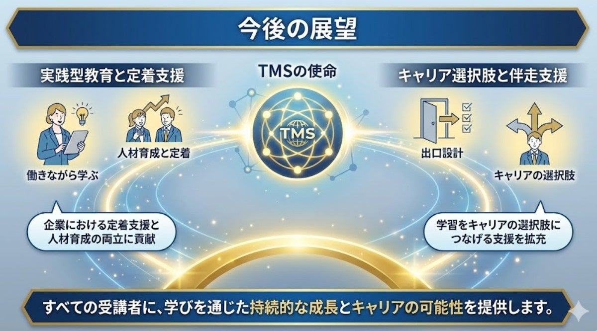私たちは、TMSを通じて、働きながら学べる実践型教育と伴走支援を提供し、企業における定着支援と人材育成の両立に貢献することを目指します。