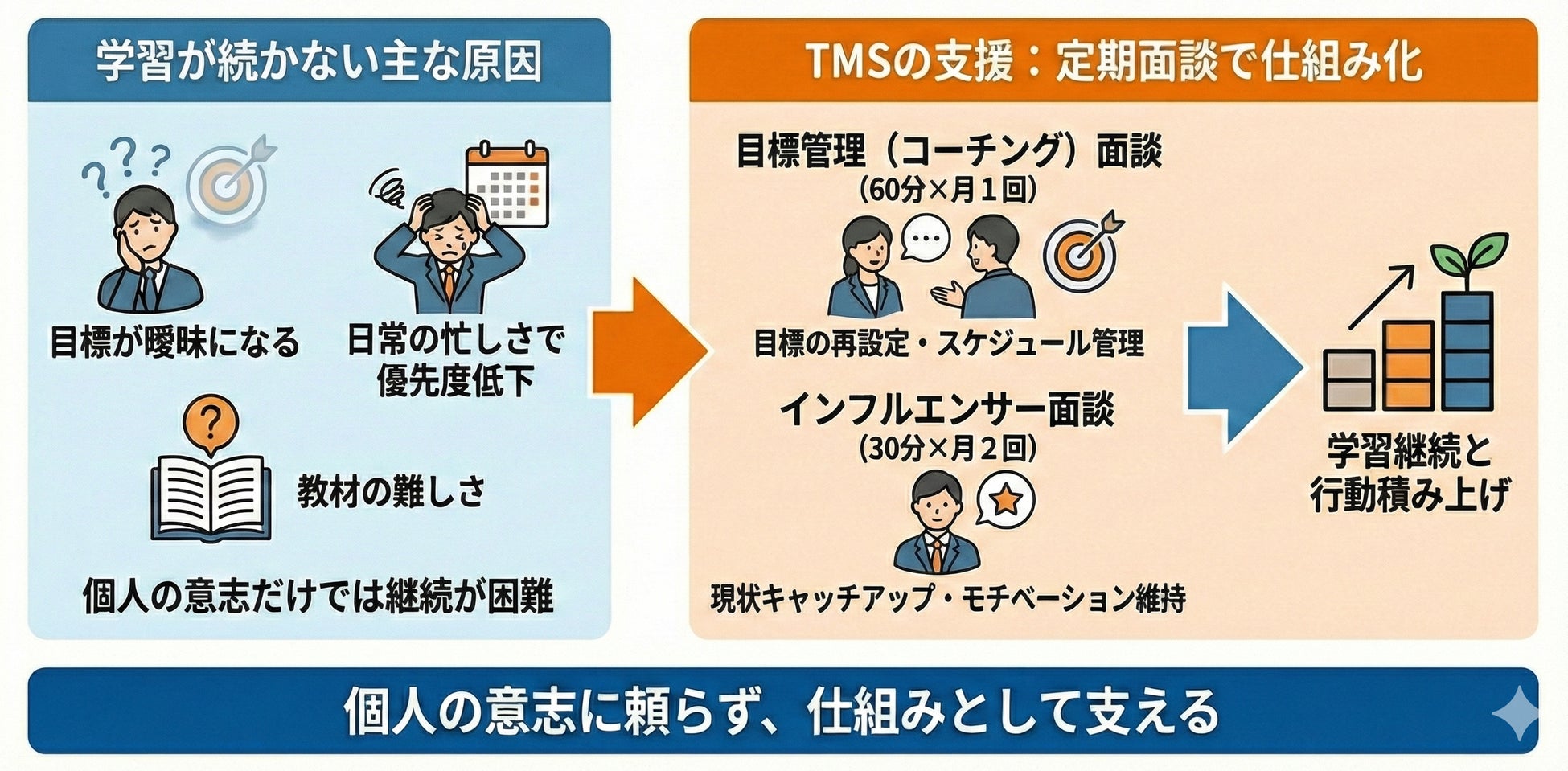 TMSでは、目標管理(コーチング)面談を60分×月1回とインフルエンサー面談を30分×月2回を組み合わせ、目標の再設定、スケジュール管理、現状のキャッチアップを行います。