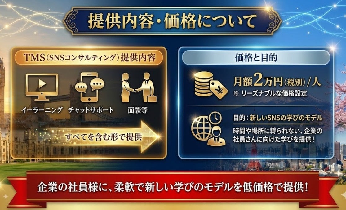 TMS(SNSコンサルティング)は、イーラーニング/チャットサポート/面談等を含む形で、月額2万円(税別)/人で提供しています。