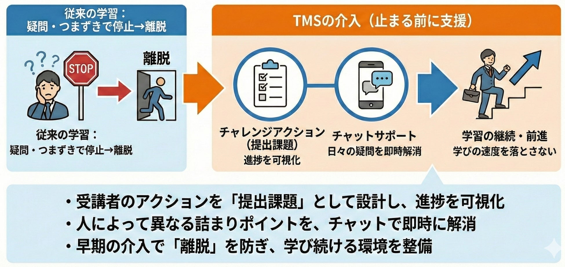 TMSではこの点を前提に、受講者が“止まる前”に支援が入るよう、学習の進捗をチャレンジアクション(提出課題)で可視化し、チャットを通じてリアルタイムに疑問解消と軌道修正ができる設計としています。
