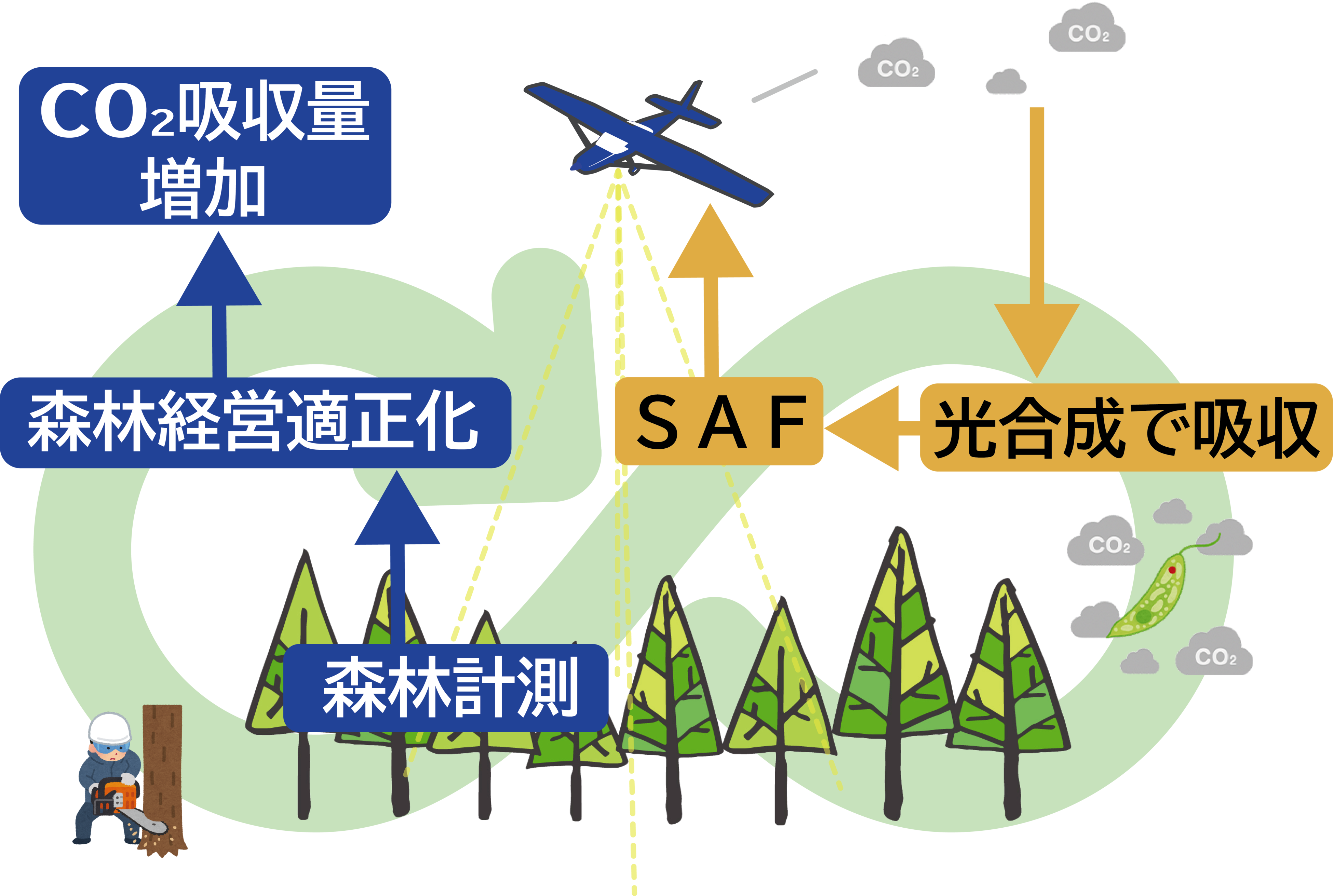当該業務は、森林のレーザ計測や航空写真撮影※2によって、遠野市内の森林情報(樹高や樹種など)を取得し、森林資源解析による森林情報の見える化と、森林の適正な維持管理のための「森林情報データベース」の作成を目的としています。森林が適正に維持管理されることで森林によるCO2吸収量の増加が期待できますが、従来のジェット燃料によるレーザ測量では、飛行によって大気中へのCO2排出を逆に増やしてしまう側面がありました。当該業務では、レーザ測量の航空燃料にSAFを導入することによる、CO2排出削減を目指す最初の取り組みになりました。